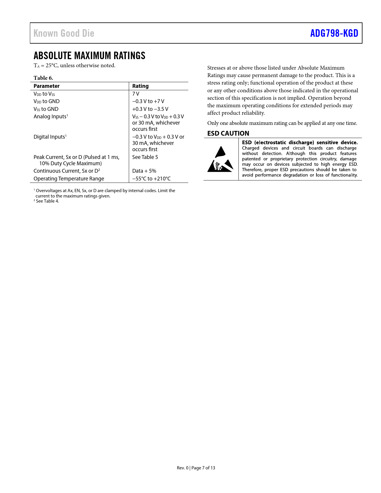 Known Good Die ADG798-KGD ABSOLUTE MAXIMUM RATINGS Table 6 Parameter Rating ESD CAUTION
