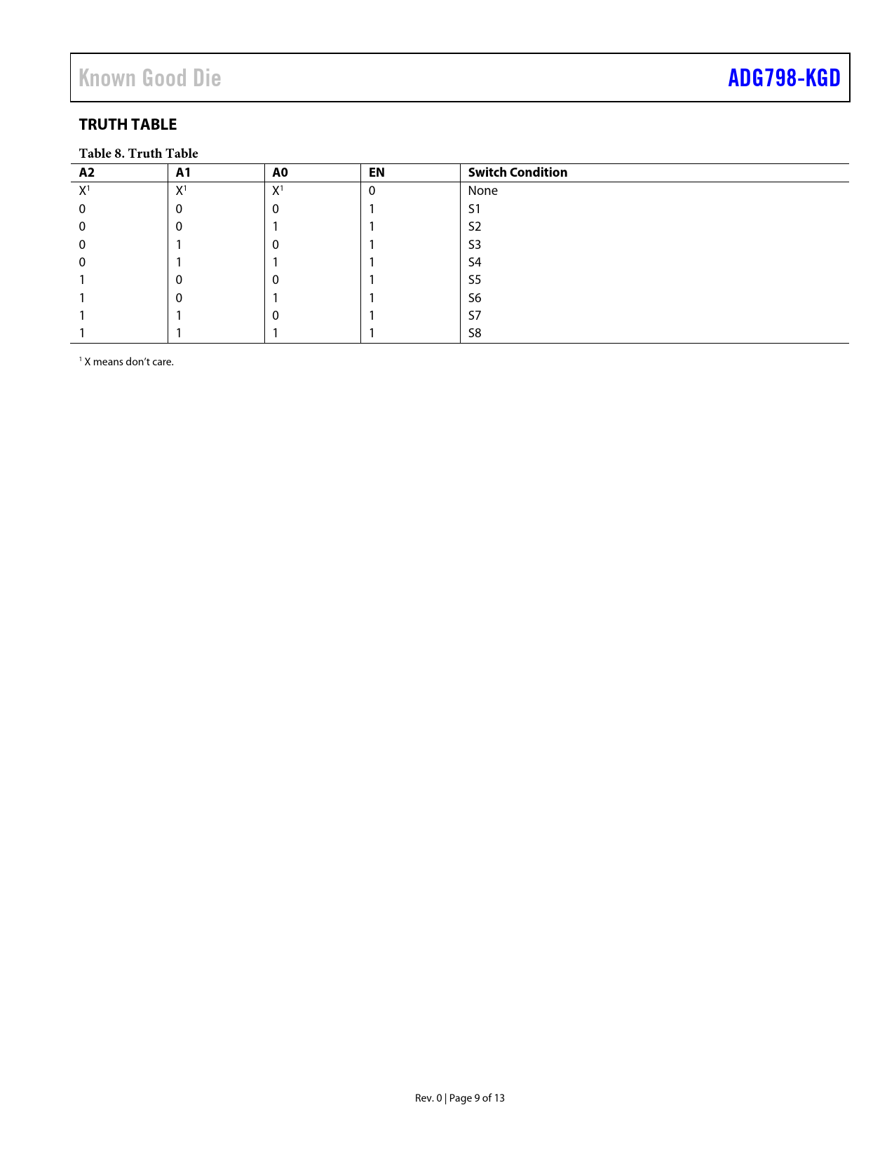 Páginas / Página13 / 9 — Known Good Die. ADG798-KGD. TRUTH TABLE. Table 8. Truth Table A2. Switch …