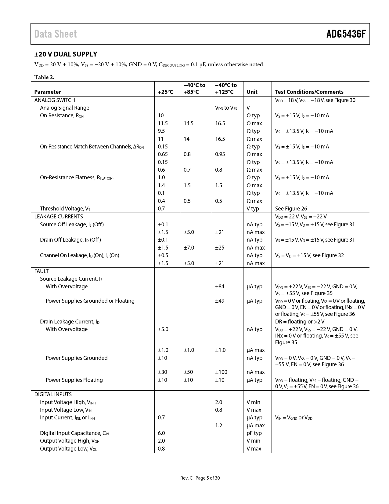 Data Sheet. ADG5436F. ±20 V DUAL SUPPLY. Table 2. −40°C to. Parameter. +25°C. +85°C. +125°C. Unit. Test Conditions/Comments