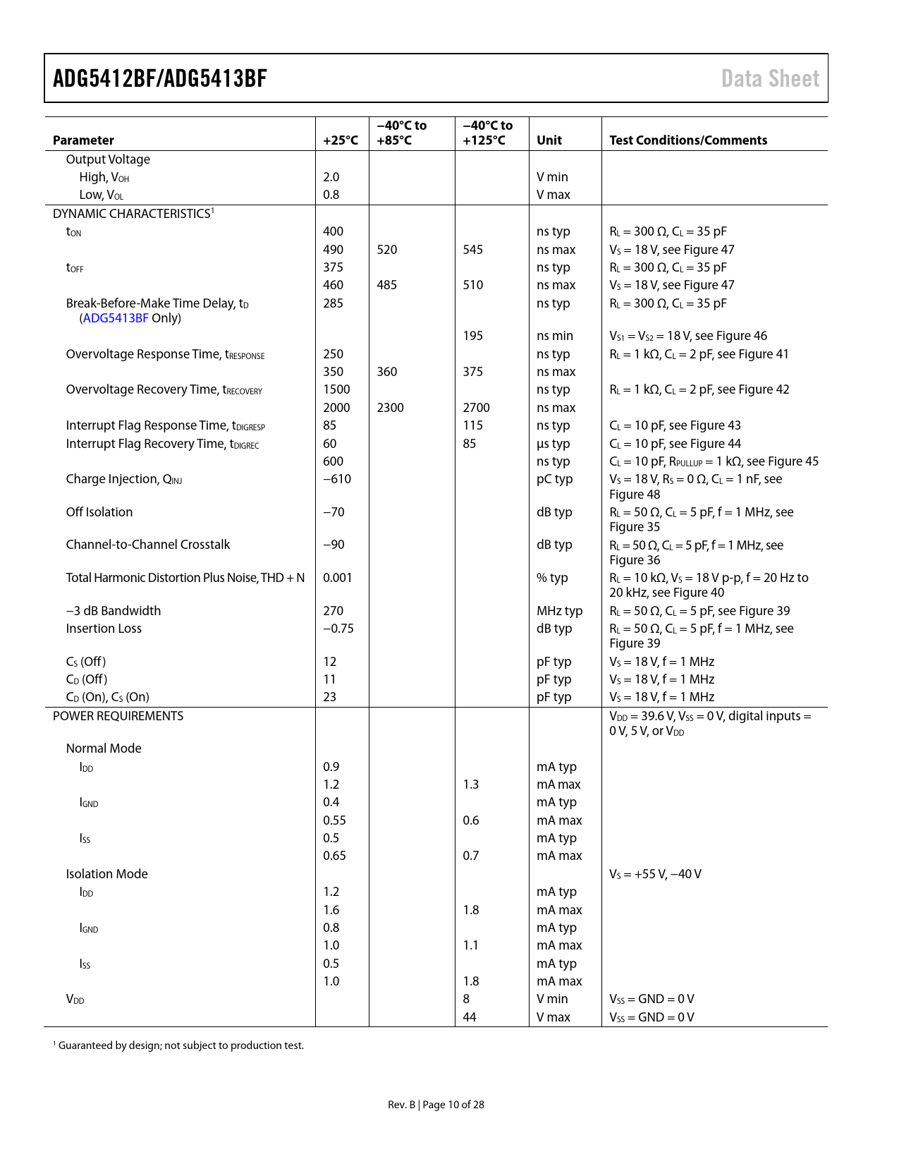 link to page 22 link to page 22 link to page 21 link to page 20 link to page 20 link to page 20 link to page 21 link to page 21 link to page 22 link to page 19 link to page 19 link to page 19 link to page 19 link to page 19 ADG5412BF/ADG5413BFData Sheet−40°C to−40°C toParameter +25°C+85°C+125°C UnitTestConditions/Comments Output Voltage High, VOH 2.0 V min Low, VOL 0.8 V max DYNAMIC CHARACTERISTICS1 tON 400 ns typ RL = 300 Ω, CL = 35 pF 490 520 545 ns max VS = 18 V, see Figure 47 tOFF 375 ns typ RL = 300 Ω, CL = 35 pF 460 485 510 ns max VS = 18 V, see Figure 47 Break-Before-Make Time Delay, tD 285 ns typ RL = 300 Ω, CL = 35 pF (ADG5413BF Only) 195 ns min VS1 = VS2 = 18 V, see Figure 46 Overvoltage Response Time, tRESPONSE 250 ns typ RL = 1 kΩ, CL = 2 pF, see Figure 41 350 360 375 ns max Overvoltage Recovery Time, tRECOVERY 1500 ns typ RL = 1 kΩ, CL = 2 pF, see Figure 42 2000 2300 2700 ns max Interrupt Flag Response Time, tDIGRESP 85 115 ns typ CL = 10 pF, see Figure 43 Interrupt Flag Recovery Time, tDIGREC 60 85 μs typ CL = 10 pF, see Figure 44 600 ns typ CL = 10 pF, RPULLUP = 1 kΩ, see Figure 45 Charge Injection, QINJ −610 pC typ VS = 18 V, RS = 0 Ω, CL = 1 nF, see Figure 48 Off Isolation −70 dB typ RL = 50 Ω, CL = 5 pF, f = 1 MHz, see Figure 35 Channel-to-Channel Crosstalk −90 dB typ RL = 50 Ω, CL = 5 pF, f = 1 MHz, see Figure 36 Total Harmonic Distortion Plus Noise, THD + N 0.001 % typ RL = 10 kΩ, VS = 18 V p-p, f = 20 Hz to 20 kHz, see Figure 40 −3 dB Bandwidth 270 MHz typ RL = 50 Ω, CL = 5 pF, see Figure 39 Insertion Loss −0.75 dB typ RL = 50 Ω, CL = 5 pF, f = 1 MHz, see Figure 39 CS (Off ) 12 pF typ VS = 18 V, f = 1 MHz CD (Off ) 11 pF typ VS = 18 V, f = 1 MHz CD (On), CS (On) 23 pF typ VS = 18 V, f = 1 MHz POWER REQUIREMENTS VDD = 39.6 V, VSS = 0 V, digital inputs = 0 V, 5 V, or VDD Normal Mode IDD 0.9 mA typ 1.2 1.3 mA max IGND 0.4 mA typ 0.55 0.6 mA max ISS 0.5 mA typ 0.65 0.7 mA max Isolation Mode VS = +55 V, −40 V IDD 1.2 mA typ 1.6 1.8 mA max IGND 0.8 mA typ 1.0 1.1 mA max ISS 0.5 mA typ 1.0 1.8 mA max VDD 8 V min VSS = GND = 0 V 44 V max VSS = GND = 0 V 1 Guaranteed by design; not subject to production test. Rev. B | Page 10 of 28 Document Outline FEATURES APPLICATIONS FUNCTIONAL BLOCK DIAGRAMS GENERAL DESCRIPTION PRODUCT HIGHLIGHTS TABLE OF CONTENTS REVISION HISTORY SPECIFICATIONS ±15 V DUAL-SUPPLY ±20 V DUAL-SUPPLY 12 V SINGLE-SUPPLY 36 V SINGLE-SUPPLY CONTINUOUS CURRENT PER CHANNEL, Sx OR Dx ABSOLUTE MAXIMUM RATINGS ESD CAUTION PIN CONFIGURATION AND FUNCTION DESCRIPTIONS TYPICAL PERFORMANCE CHARACTERISTICS TEST CIRCUITS TERMINOLOGY THEORY OF OPERATION SWITCH ARCHITECTURE ESD Performance Trench Isolation FAULT PROTECTION Power-On Protection Power-Off Protection Digital Input Protection Overvoltage Interrupt Flag APPLICATIONS INFORMATION POWER SUPPLY RAILS POWER SUPPLY SEQUENCING PROTECTION SIGNAL RANGE LOW IMPEDANCE CHANNEL PROTECTION HIGH VOLTAGE SURGE SUPPRESSION INTELLIGENT FAULT DETECTION LARGE VOLTAGE, HIGH FREQUENCY SIGNALS OUTLINE DIMENSIONS ORDERING GUIDE