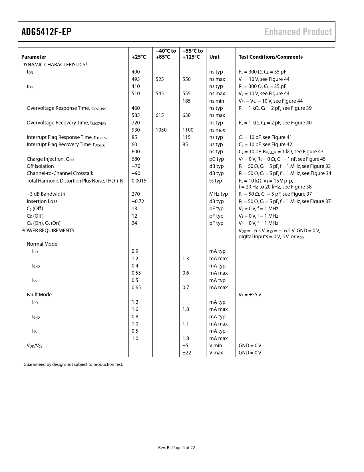 ADG5412F-EP. Enhanced Product. −40°C to −55°C to. Parameter. +25°C. +85°C. +125°C. Unit. Test Conditions/Comments