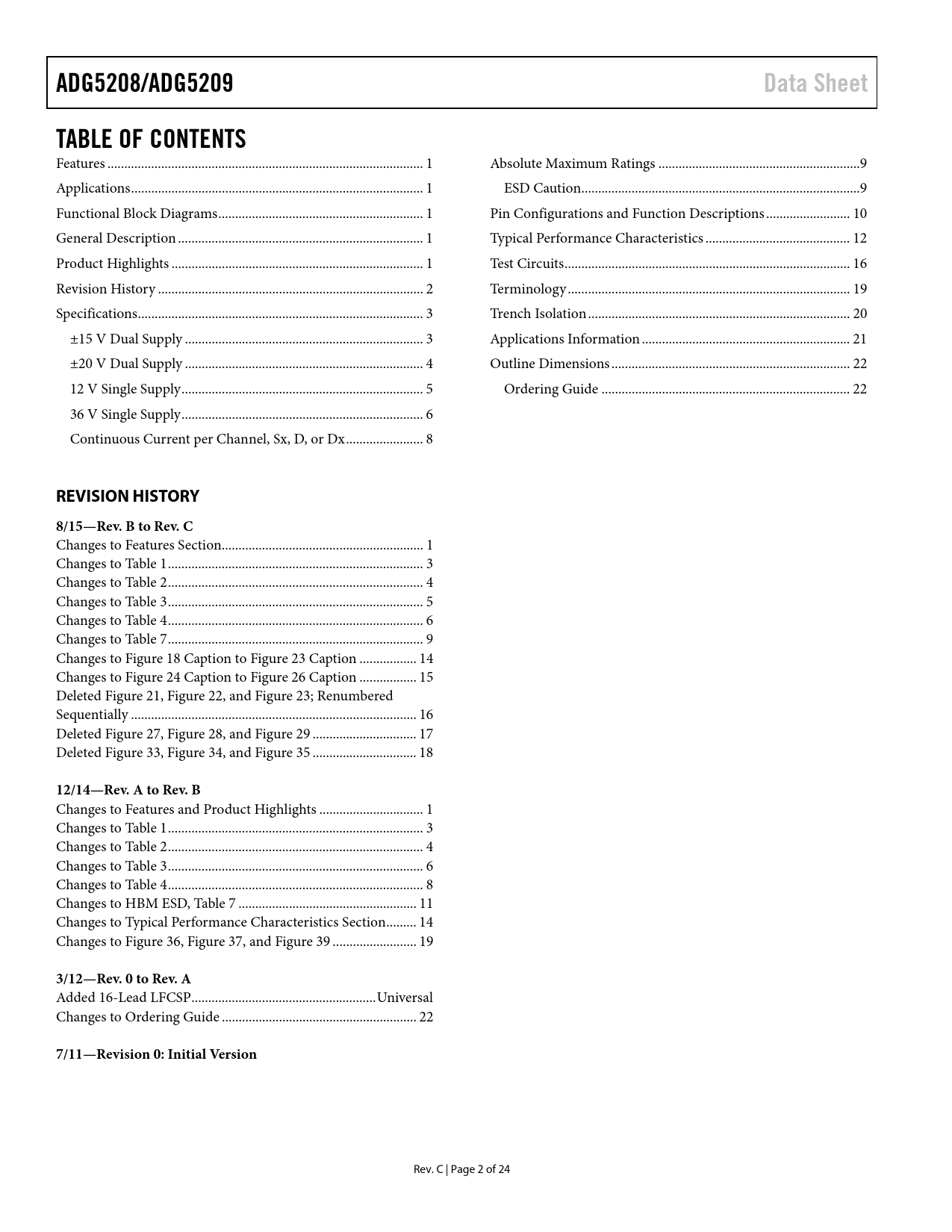 ADG5208/ADG5209 Data Sheet TABLE OF CONTENTS REVISION HISTORY 8/15—Rev B to Rev C 12/14—Rev A to Rev B