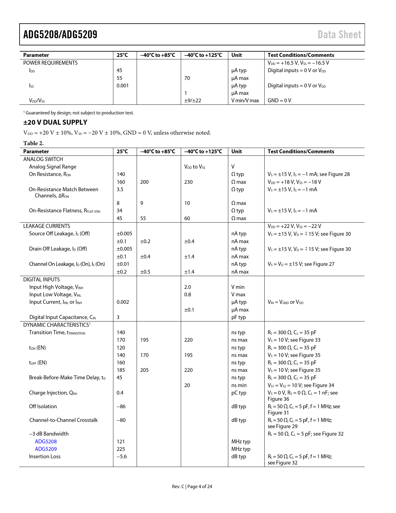 ADG5208/ADG5209. Data Sheet. Parameter. 25°C. −40°C to +85°C. −40°C to +125°C. Unit. Test Conditions/Comments. ±20 V DUAL SUPPLY