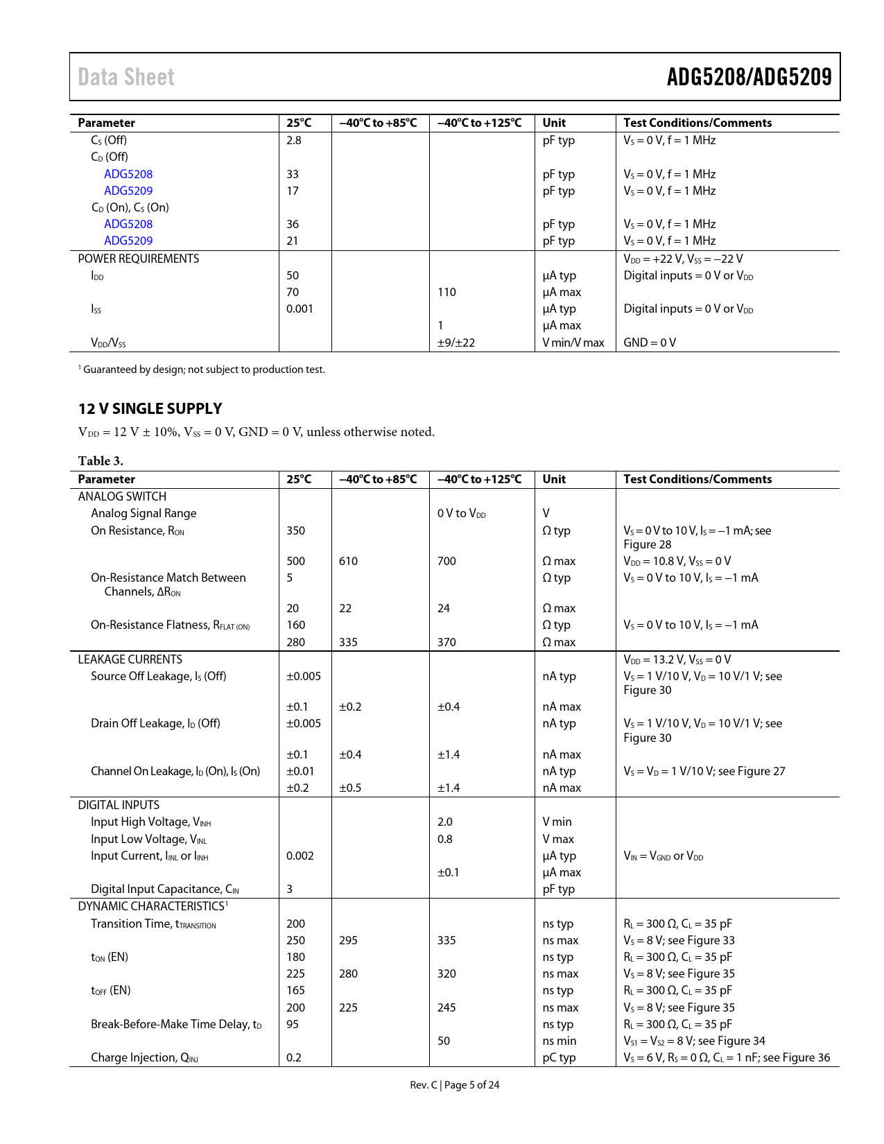 Data Sheet ADG5208/ADG5209 Parameter 25°C −40°C to +85°C −40°C to +125°C Unit Test Conditions/Comments 12 V SINGLE SUPPLY