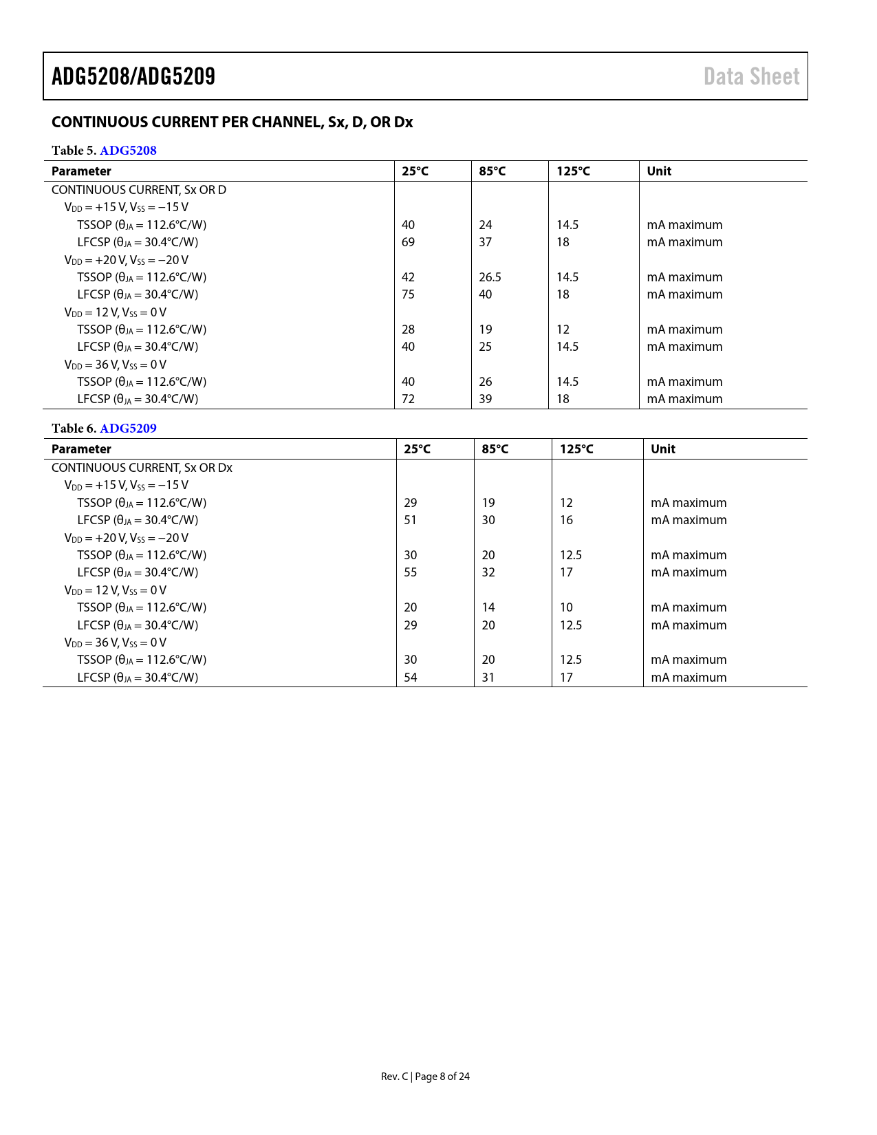 CONTINUOUS CURRENT, Sx OR D VDD = +15 V, VSS = −15 V TSSOP (θJA = 112.6°C/W) 40 24 14.5 mA maximum LFCSP (θJA = 30.4°C/W) 69 37 18 mA maximum VDD = +20 V, VSS = −20 V TSSOP (θJA = 112.6°C/W) 42 26.5 14.5 mA maximum LFCSP (θJA = 30.4°C/W) 75 40 18 mA maximum VDD = 12 V, VSS = 0 V TSSOP (θJA = 112.6°C/W) 28 19 12 mA maximum LFCSP (θJA = 30.4°C/W) 40 25 14.5 mA maximum VDD = 36 V, VSS = 0 V TSSOP (θJA = 112.6°C/W) 40 26 14.5 mA maximum LFCSP (θJA = 30.4°C/W) 72 39 18 mA maximum