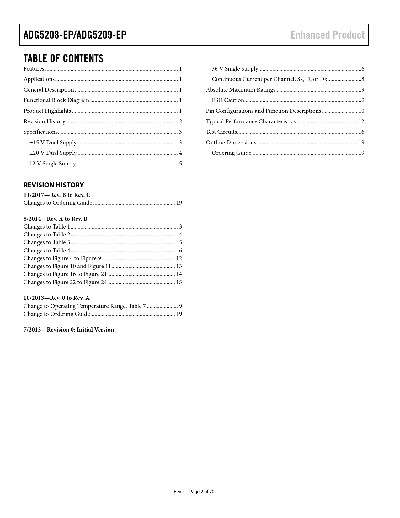 ADG5208-EP/ADG5209-EP Enhanced Product TABLE OF CONTENTS REVISION HISTORY 11/2017—Rev B to Rev C 8/2014—Rev A to Rev B