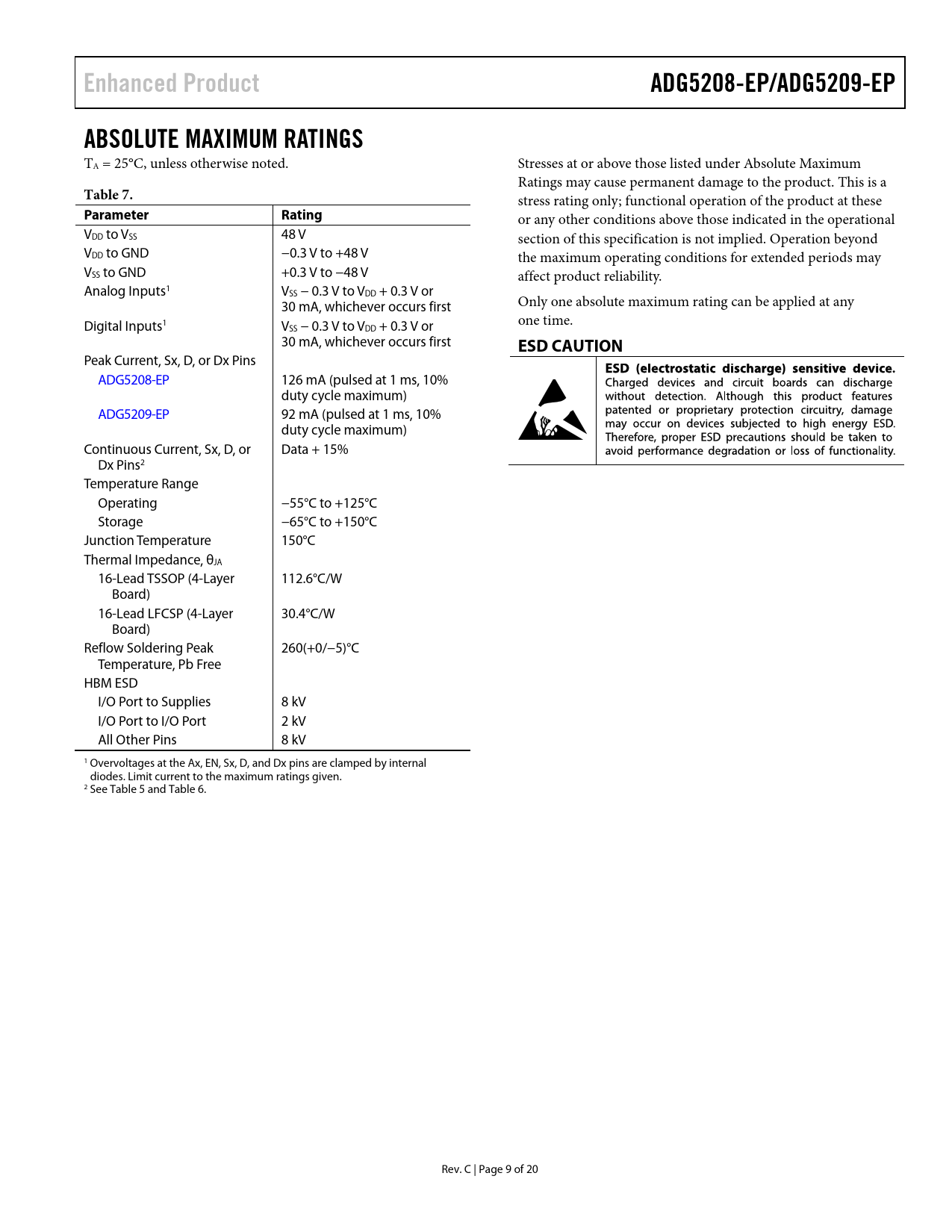 Enhanced Product. ADG5208-EP/ADG5209-EP. ABSOLUTE MAXIMUM RATINGS. Table 7. Parameter. Rating. ESD CAUTION