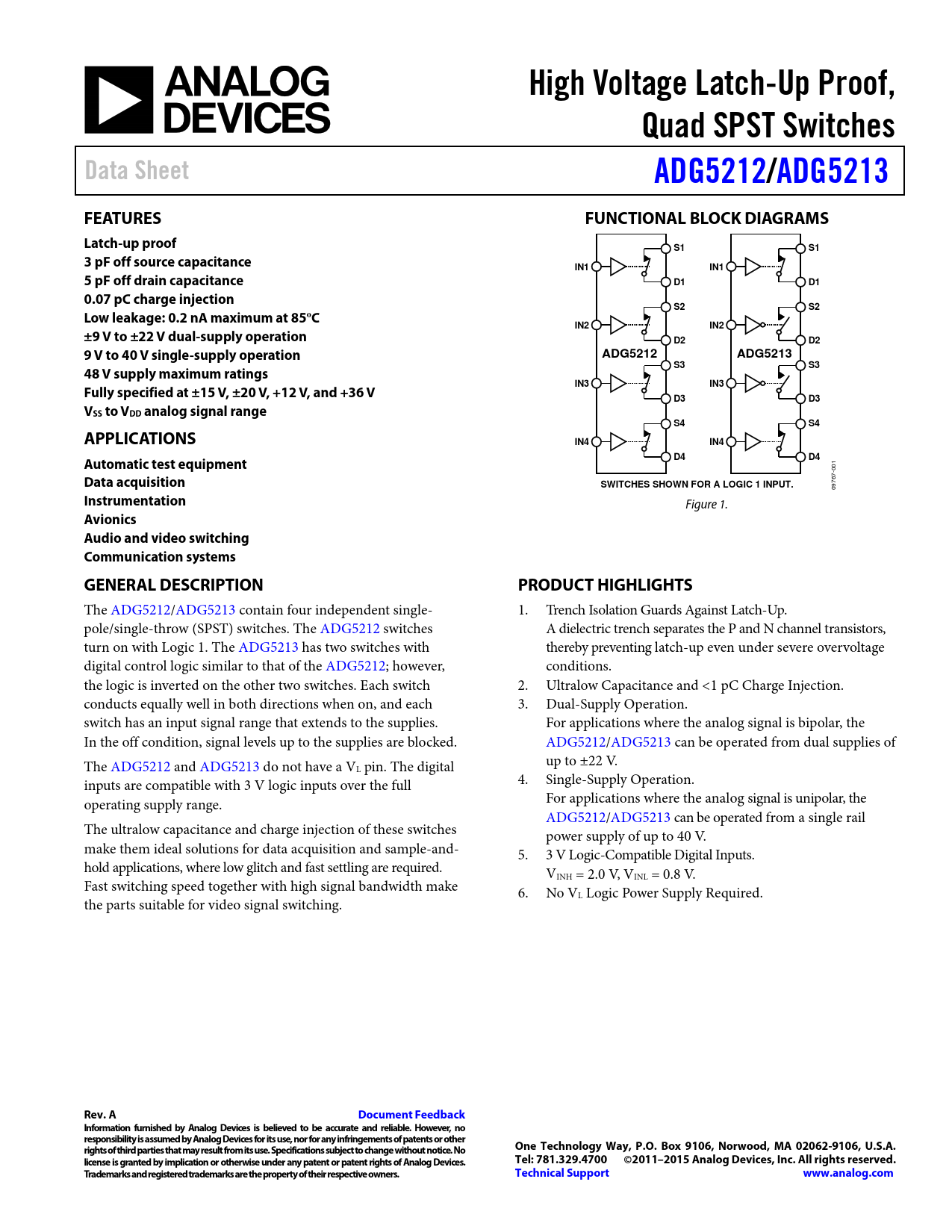 High Voltage Latch-Up Proof,. Quad SPST Switches. Data Sheet. ADG5212. /ADG5213. FEATURES. FUNCTIONAL BLOCK DIAGRAMS. Latch-up proof