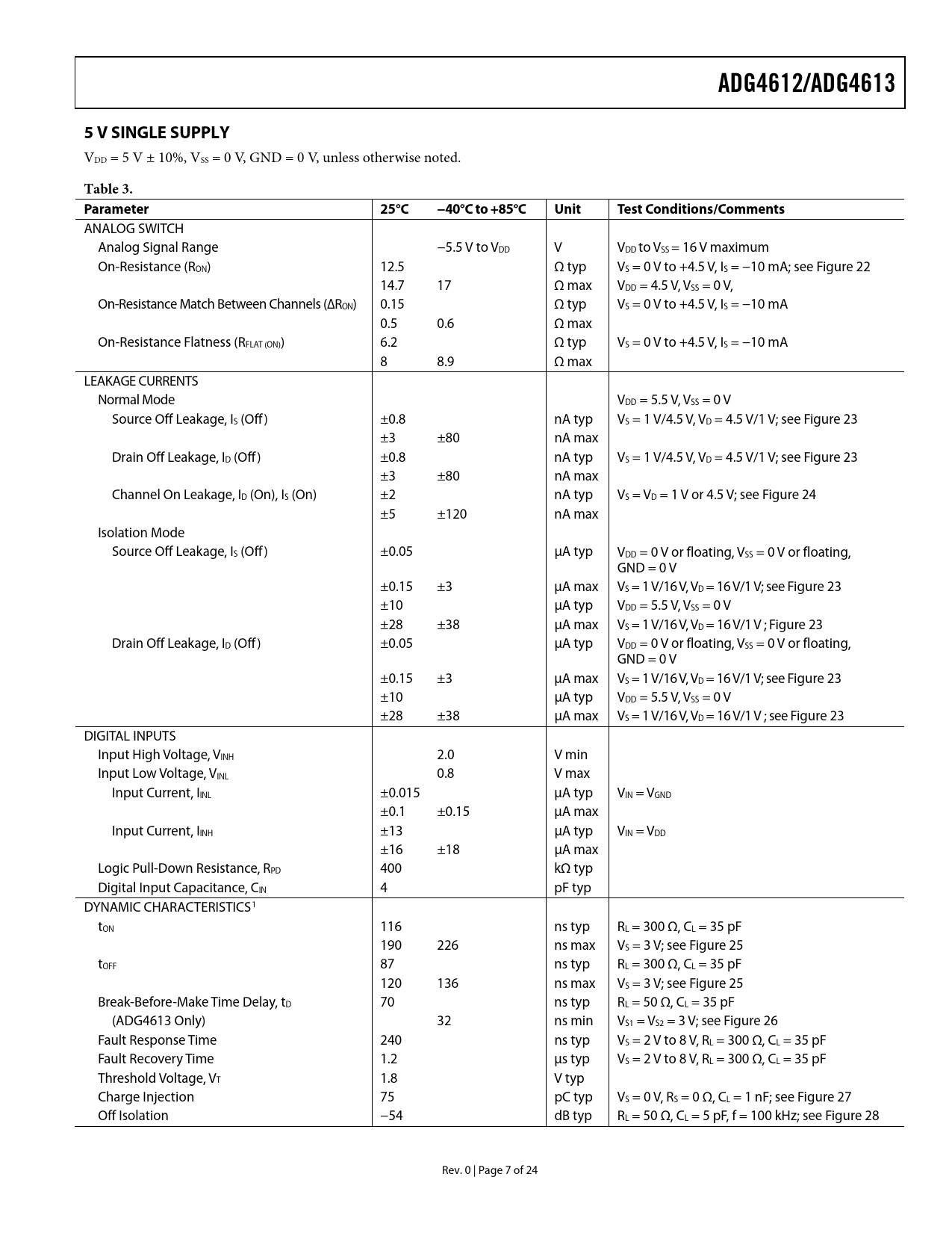 ADG4612/ADG4613. 5 V SINGLE SUPPLY. Table 3. Parameter. 25°C. −40°C to +85°C. Unit. Test Conditions/Comments