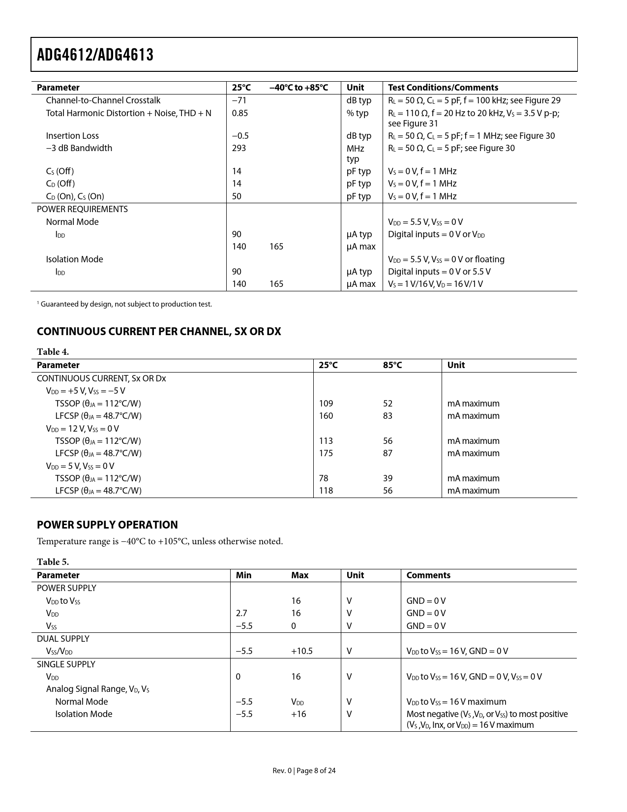 ADG4612/ADG4613. Parameter. 25°C. −40°C to +85°C. Unit. Test Conditions/Comments. CONTINUOUS CURRENT PER CHANNEL, SX OR DX