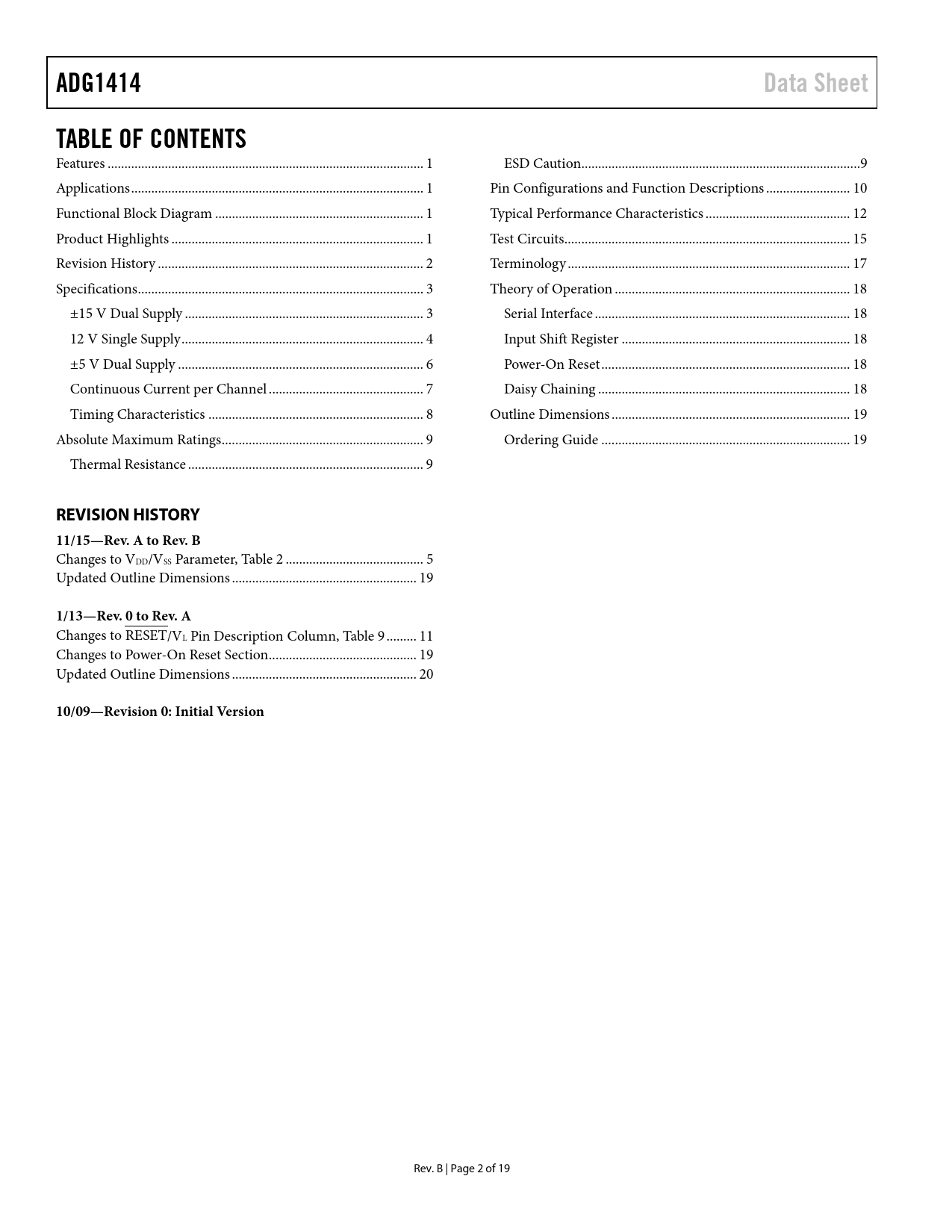 Páginas / Página19 / 2 — ADG1414. Data Sheet. TABLE OF CONTENTS. REVISION HISTORY 11/15—Rev. A to …