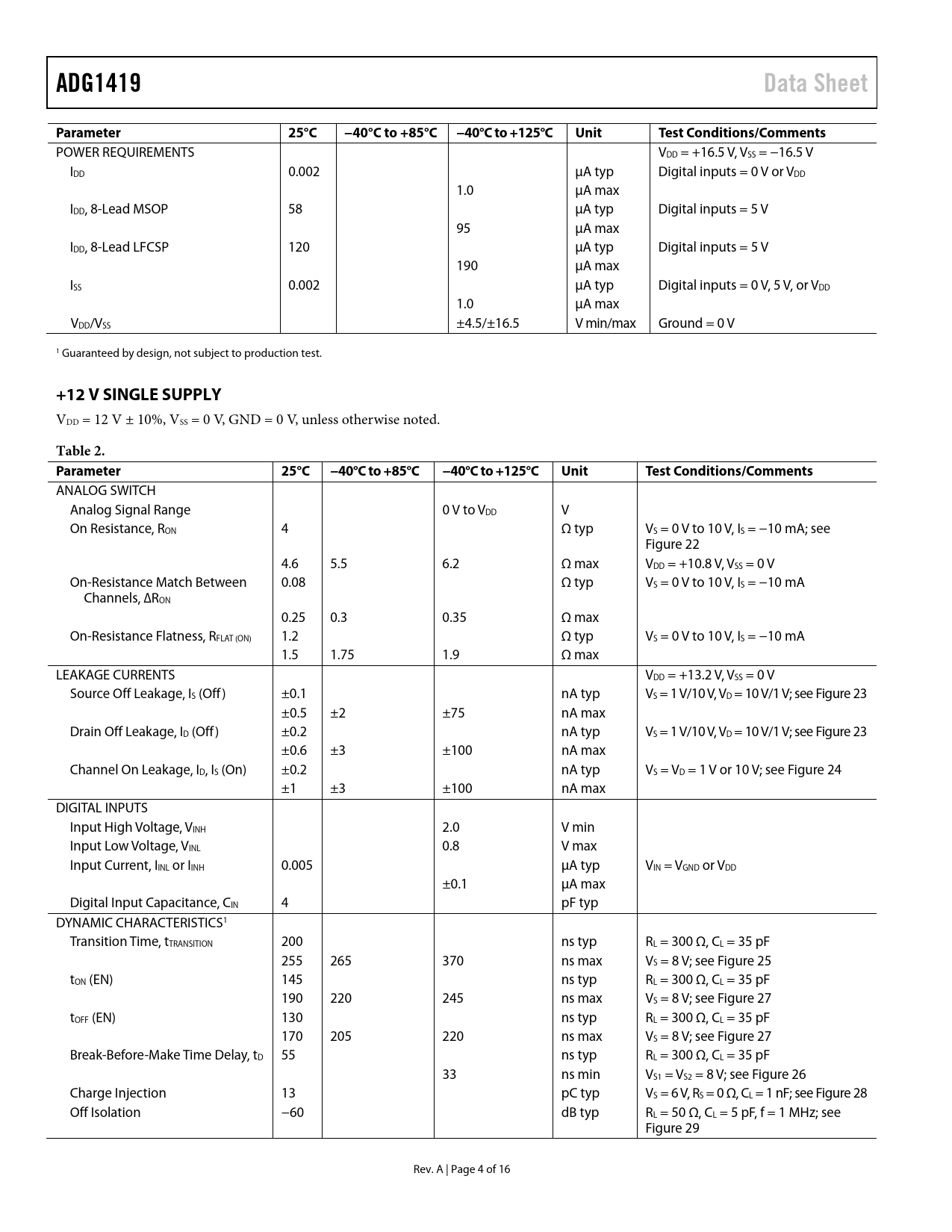 ADG1419. Data Sheet. Parameter. 25°C. −40°C to +85°C. −40°C to +125°C. Unit. Test Conditions/Comments. +12 V SINGLE SUPPLY