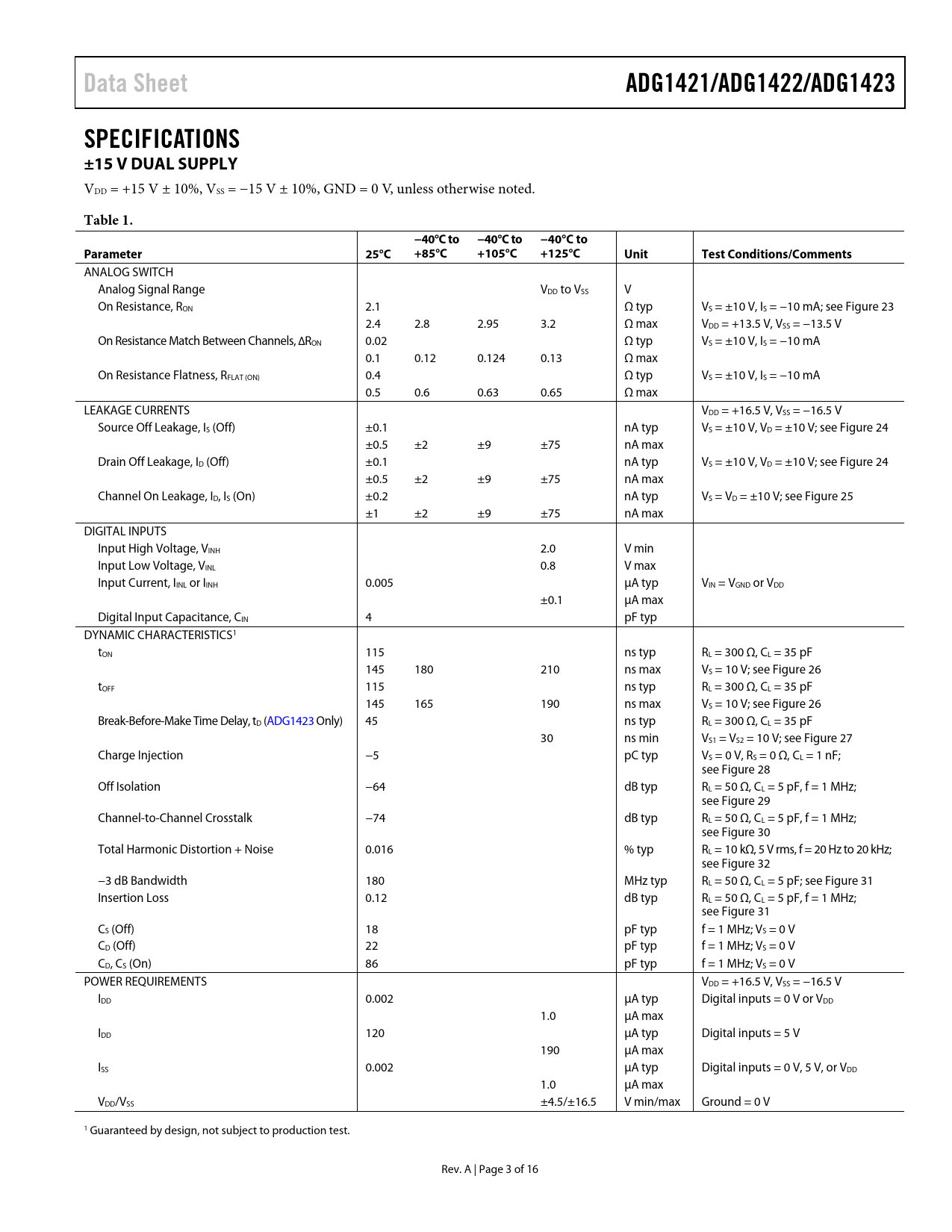 link to page 12 link to page 12 link to page 12 link to page 12 link to page 12 link to page 12 link to page 12 link to page 12 link to page 13 link to page 13 link to page 13 link to page 13 link to page 13 Data SheetADG1421/ADG1422/ADG1423SPECIFICATIONS ±15 V DUAL SUPPLY VDD = +15 V ± 10%, VSS = −15 V ± 10%, GND = 0 V, unless otherwise noted. Table 1.−40°C to−40°C to−40°C toParameter 25°C+85°C+105°C+125°CUnit TestConditions/Comments ANALOG SWITCH Analog Signal Range VDD to VSS V On Resistance, RON 2.1 Ω typ VS = ±10 V, IS = −10 mA; see Figure 23 2.4 2.8 2.95 3.2 Ω max VDD = +13.5 V, VSS = −13.5 V On Resistance Match Between Channels, ∆RON 0.02 Ω typ VS = ±10 V, IS = −10 mA 0.1 0.12 0.124 0.13 Ω max On Resistance Flatness, RFLAT (ON) 0.4 Ω typ VS = ±10 V, IS = −10 mA 0.5 0.6 0.63 0.65 Ω max LEAKAGE CURRENTS VDD = +16.5 V, VSS = −16.5 V Source Off Leakage, IS (Off) ±0.1 nA typ VS = ±10 V, VD = ±10 V; see Figure 24 ±0.5 ±2 ±9 ±75 nA max Drain Off Leakage, ID (Off) ±0.1 nA typ VS = ±10 V, VD = ±10 V; see Figure 24 ±0.5 ±2 ±9 ±75 nA max Channel On Leakage, ID, IS (On) ±0.2 nA typ VS = VD = ±10 V; see Figure 25 ±1 ±2 ±9 ±75 nA max DIGITAL INPUTS Input High Voltage, VINH 2.0 V min Input Low Voltage, VINL 0.8 V max Input Current, IINL or IINH 0.005 μA typ VIN = VGND or VDD ±0.1 μA max Digital Input Capacitance, CIN 4 pF typ DYNAMIC CHARACTERISTICS1 tON 115 ns typ RL = 300 Ω, CL = 35 pF 145 180 210 ns max VS = 10 V; see Figure 26 tOFF 115 ns typ RL = 300 Ω, CL = 35 pF 145 165 190 ns max VS = 10 V; see Figure 26 Break-Before-Make Time Delay, tD (ADG1423 Only) 45 ns typ RL = 300 Ω, CL = 35 pF 30 ns min VS1 = VS2 = 10 V; see Figure 27 Charge Injection −5 pC typ VS = 0 V, RS = 0 Ω, CL = 1 nF; see Figure 28 Off Isolation −64 dB typ RL = 50 Ω, CL = 5 pF, f = 1 MHz; see Figure 29 Channel-to-Channel Crosstalk −74 dB typ RL = 50 Ω, CL = 5 pF, f = 1 MHz; see Figure 30 Total Harmonic Distortion + Noise 0.016 % typ RL = 10 kΩ, 5 V rms, f = 20 Hz to 20 kHz; see Figure 32 −3 dB Bandwidth 180 MHz typ RL = 50 Ω, CL = 5 pF; see Figure 31 Insertion Loss 0.12 dB typ RL = 50 Ω, CL = 5 pF, f = 1 MHz; see Figure 31 CS (Off) 18 pF typ f = 1 MHz; VS = 0 V CD (Off) 22 pF typ f = 1 MHz; VS = 0 V CD, CS (On) 86 pF typ f = 1 MHz; VS = 0 V POWER REQUIREMENTS VDD = +16.5 V, VSS = −16.5 V IDD 0.002 μA typ Digital inputs = 0 V or VDD 1.0 μA max IDD 120 μA typ Digital inputs = 5 V 190 μA max ISS 0.002 μA typ Digital inputs = 0 V, 5 V, or VDD 1.0 μA max VDD/VSS ±4.5/±16.5 V min/max Ground = 0 V 1 Guaranteed by design, not subject to production test. Rev. A | Page 3 of 16 Document Outline Features Applications General Description Functional Block Diagram Product Highlights Table of Contents Revision History Specifications ±15 V Dual Supply +12 V Single Supply ±5 V Dual Supply Continuous Current per Channel, S or D Absolute Maximum Ratings Thermal Resistance ESD Caution Pin Configurations and Function Descriptions Typical Performance Characteristics Test Circuits Terminology Outline Dimensions Ordering Guide