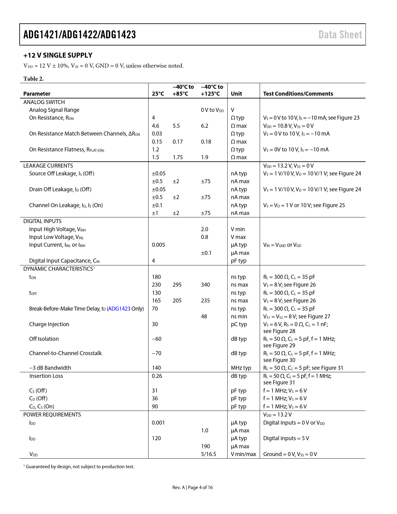 link to page 12 link to page 12 link to page 12 link to page 12 link to page 12 link to page 12 link to page 12 link to page 12 link to page 13 link to page 13 link to page 13 link to page 13 ADG1421/ADG1422/ADG1423Data Sheet+12 V SINGLE SUPPLY VDD = 12 V ± 10%, VSS = 0 V, GND = 0 V, unless otherwise noted. Table 2.−40°C to −40°C toParameter25°C+85°C+125°CUnitTest Conditions/Comments ANALOG SWITCH Analog Signal Range 0 V to VDD V On Resistance, RON 4 Ω typ VS = 0 V to 10 V, IS = −10 mA; see Figure 23 4.6 5.5 6.2 Ω max VDD = 10.8 V, VSS = 0 V On Resistance Match Between Channels, ∆RON 0.03 Ω typ VS = 0 V to 10 V, IS = −10 mA 0.15 0.17 0.18 Ω max On Resistance Flatness, RFLAT (ON) 1.2 Ω typ VS = 0V to 10 V, IS = −10 mA 1.5 1.75 1.9 Ω max LEAKAGE CURRENTS VDD = 13.2 V, VSS = 0 V Source Off Leakage, IS (Off) ±0.05 nA typ VS = 1 V/10 V, VD = 10 V/1 V; see Figure 24 ±0.5 ±2 ±75 nA max Drain Off Leakage, ID (Off) ±0.05 nA typ VS = 1 V/10 V, VD = 10 V/1 V; see Figure 24 ±0.5 ±2 ±75 nA max Channel On Leakage, ID, IS (On) ±0.1 nA typ VS = VD = 1 V or 10 V; see Figure 25 ±1 ±2 ±75 nA max DIGITAL INPUTS Input High Voltage, VINH 2.0 V min Input Low Voltage, VINL 0.8 V max Input Current, IINL or IINH 0.005 µA typ VIN = VGND or VDD ±0.1 µA max Digital Input Capacitance, CIN 4 pF typ DYNAMIC CHARACTERISTICS1 tON 180 ns typ RL = 300 Ω, CL = 35 pF 230 295 340 ns max VS = 8 V; see Figure 26 tOFF 130 ns typ RL = 300 Ω, CL = 35 pF 165 205 235 ns max VS = 8 V; see Figure 26 Break-Before-Make Time Delay, tD (ADG1423 Only) 70 ns typ RL = 300 Ω, CL = 35 pF 48 ns min VS1 = VS2 = 8 V; see Figure 27 Charge Injection 30 pC typ VS = 6 V, RS = 0 Ω, CL = 1 nF; see Figure 28 Off Isolation −60 dB typ RL = 50 Ω, CL = 5 pF, f = 1 MHz; see Figure 29 Channel-to-Channel Crosstalk −70 dB typ RL = 50 Ω, CL = 5 pF, f = 1 MHz; see Figure 30 −3 dB Bandwidth 140 MHz typ RL = 50 Ω, CL = 5 pF; see Figure 31 Insertion Loss 0.26 dB typ RL = 50 Ω, CL = 5 pF, f = 1 MHz; see Figure 31 CS (Off) 31 pF typ f = 1 MHz; VS = 6 V CD (Off) 36 pF typ f = 1 MHz; VS = 6 V CD, CS (On) 90 pF typ f = 1 MHz; VS = 6 V POWER REQUIREMENTS VDD = 13.2 V IDD 0.001 µA typ Digital inputs = 0 V or VDD 1.0 µA max IDD 120 µA typ Digital inputs = 5 V 190 µA max VDD 5/16.5 V min/max Ground = 0 V, VSS = 0 V 1 Guaranteed by design, not subject to production test. Rev. A | Page 4 of 16 Document Outline Features Applications General Description Functional Block Diagram Product Highlights Table of Contents Revision History Specifications ±15 V Dual Supply +12 V Single Supply ±5 V Dual Supply Continuous Current per Channel, S or D Absolute Maximum Ratings Thermal Resistance ESD Caution Pin Configurations and Function Descriptions Typical Performance Characteristics Test Circuits Terminology Outline Dimensions Ordering Guide