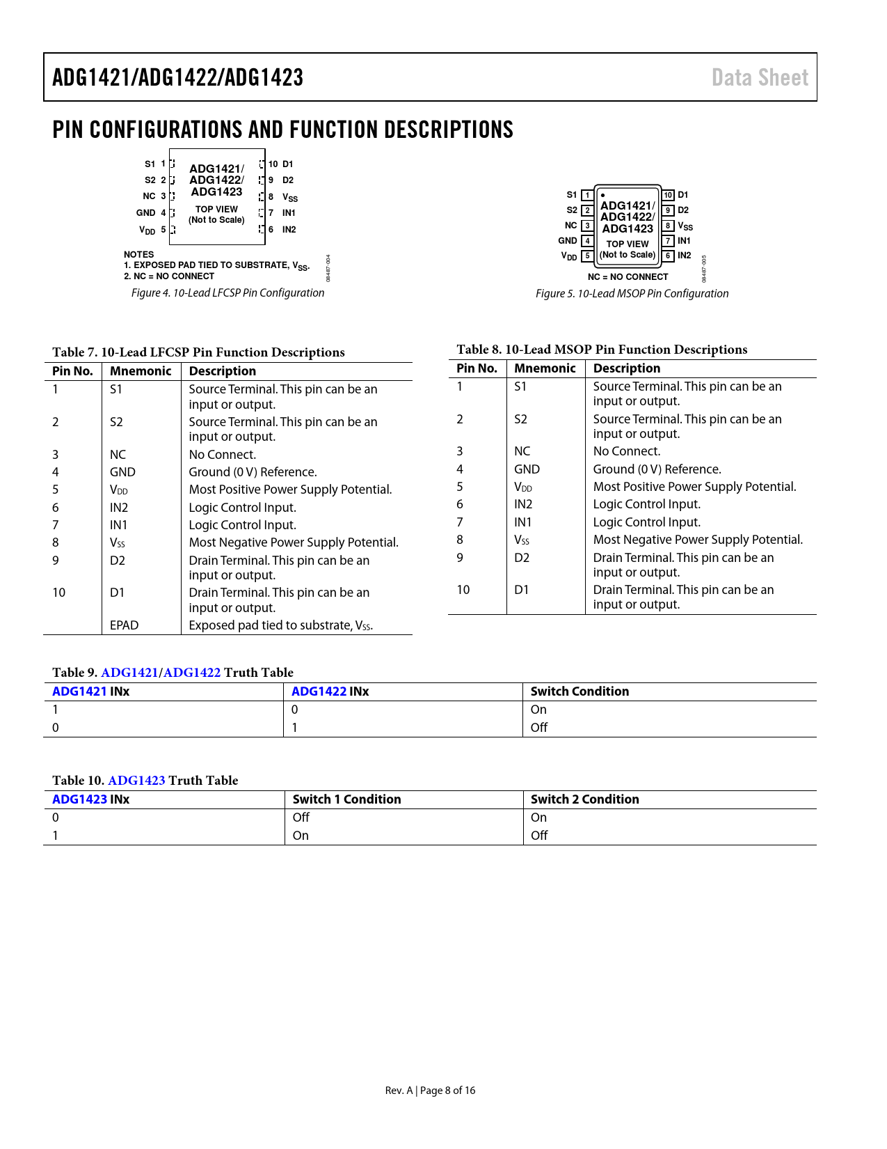 ADG1421/ADG1422/ADG1423. Data Sheet. PIN CONFIGURATIONS AND FUNCTION DESCRIPTIONS. S1 1. 10 D1. ADG1421/. S2 2. ADG1422/. ADG1423. NC 3