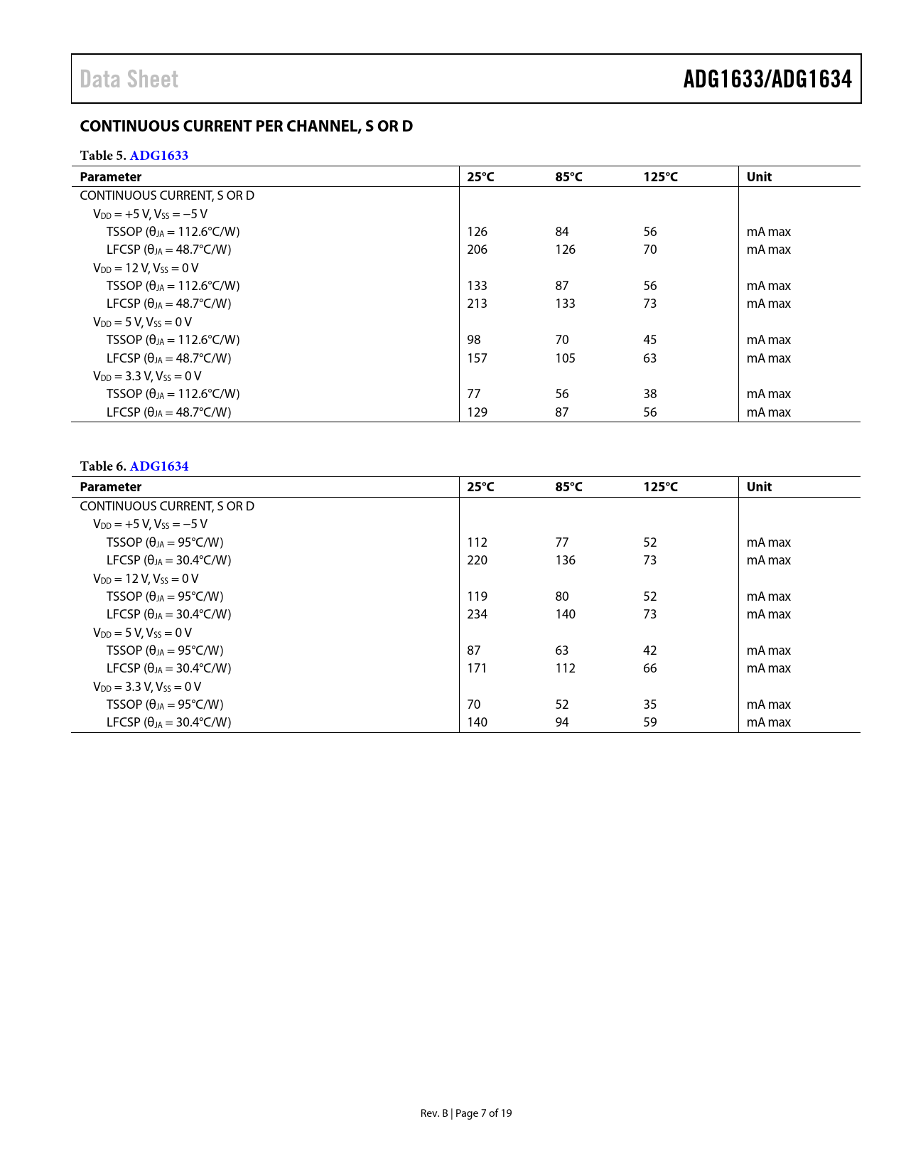 Data Sheet. ADG1633/ADG1634. CONTINUOUS CURRENT PER CHANNEL, S OR D. Table 5. ADG1633. Parameter. 25°C. 85°C. 125°C. Unit