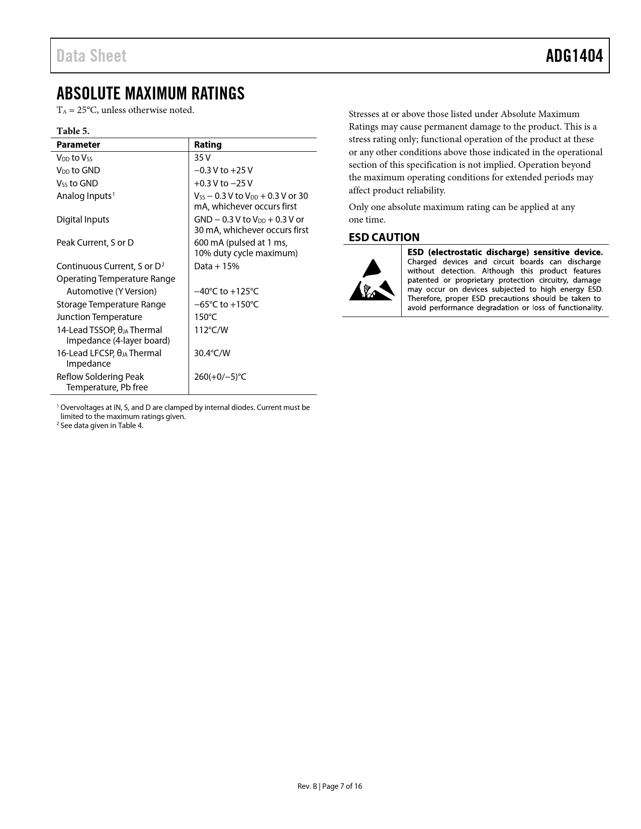 Data Sheet ADG1404 ABSOLUTE MAXIMUM RATINGS Table 5 Parameter Rating ESD CAUTION