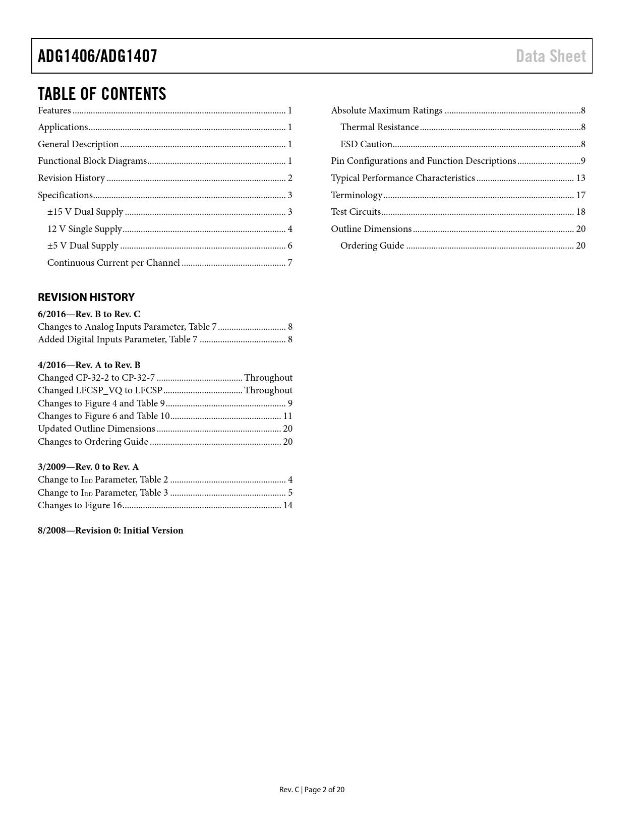 link to page 1 link to page 1 link to page 1 link to page 1 link to page 2 link to page 3 link to page 3 link to page 4 link to page 6 link to page 7 link to page 8 link to page 8 link to page 8 link to page 8 link to page 13 link to page 17 link to page 18 link to page 20 link to page 20 ADG1406/ADG1407Data SheetTABLE OF CONTENTS Features .. 1 Absolute Maximum Ratings ..8 Applications ... 1 Thermal Resistance ...8 General Description ... 1 ESD Caution...8 Functional Block Diagrams ... 1 Pin Configurations and Function Descriptions ..9 Revision History ... 2 Typical Performance Characteristics ... 13 Specifications ... 3 Terminology .. 17 ±15 V Dual Supply ... 3 Test Circuits ... 18 12 V Single Supply .. 4 Outline Dimensions ... 20 ±5 V Dual Supply ... 6 Ordering Guide .. 20 Continuous Current per Channel .. 7 REVISION HISTORY6/2016—Rev. B to Rev. C Changes to Analog Inputs Parameter, Table 7 .. 8 Added Digital Inputs Parameter, Table 7 .. 8 4/2016—Rev. A to Rev. B Changed CP-32-2 to CP-32-7 .. Throughout Changed LFCSP_VQ to LFCSP ... Throughout Changes to Figure 4 and Table 9 ... 9 Changes to Figure 6 and Table 10 ... 11 Updated Outline Dimensions ... 20 Changes to Ordering Guide .. 20 3/2009—Rev. 0 to Rev. A Change to IDD Parameter, Table 2 ... 4 Change to IDD Parameter, Table 3 ... 5 Changes to Figure 16 .. 14 8/2008—Revision 0: Initial Version Rev. C | Page 2 of 20 Document Outline FEATURES APPLICATIONS FUNCTIONAL BLOCK DIAGRAMS GENERAL DESCRIPTION TABLE OF CONTENTS REVISION HISTORY SPECIFICATIONS ±15 V DUAL SUPPLY 12 V SINGLE SUPPLY ±5 V DUAL SUPPLY CONTINUOUS CURRENT PER CHANNEL ABSOLUTE MAXIMUM RATINGS THERMAL RESISTANCE ESD CAUTION PIN CONFIGURATIONS AND FUNCTION DESCRIPTIONS TYPICAL PERFORMANCE CHARACTERISTICS TERMINOLOGY TEST CIRCUITS OUTLINE DIMENSIONS ORDERING GUIDE