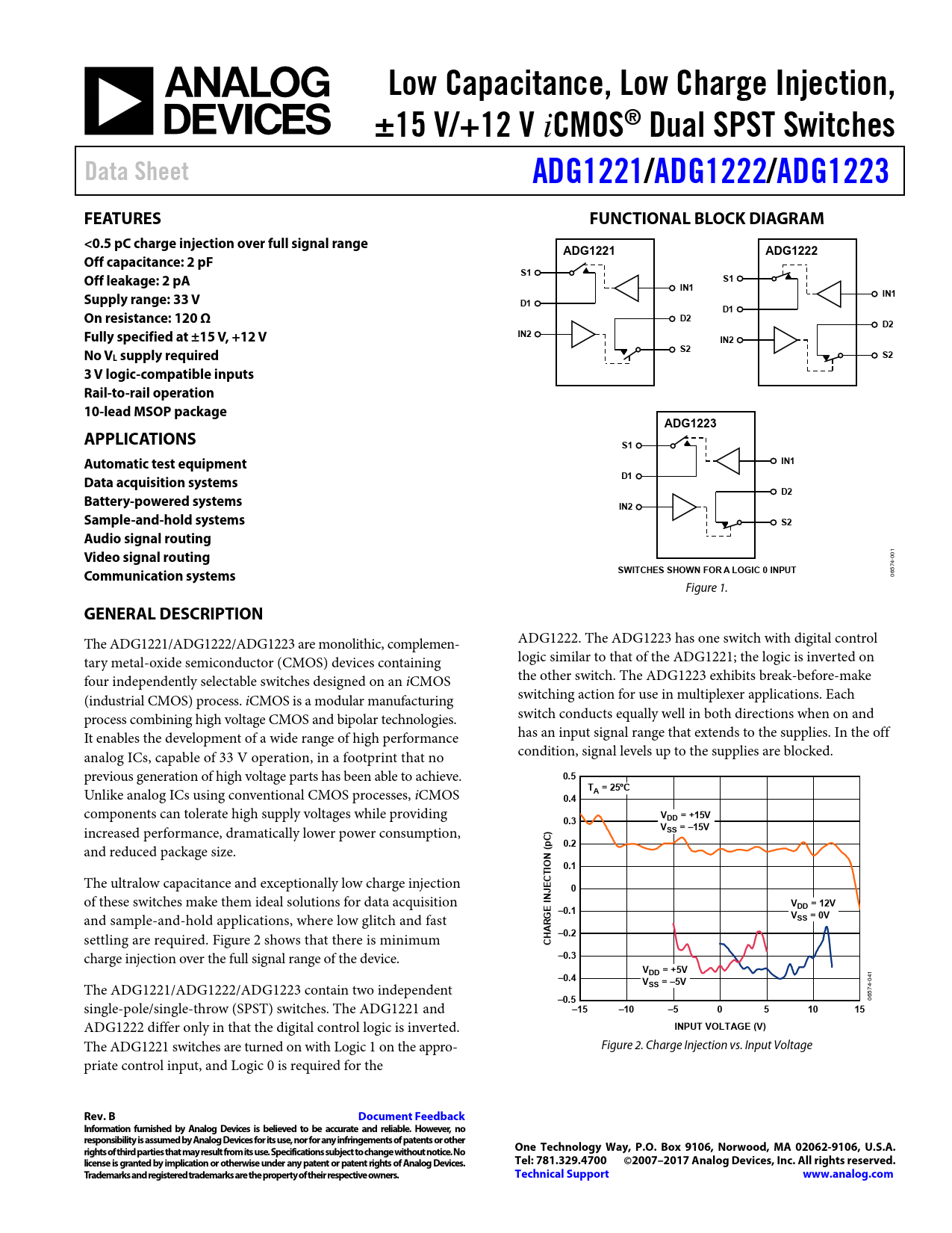 Low Capacitance, Low Charge Injection,. ±15 V/+12 V. CMOS® Dual SPST Switches. Data Sheet. ADG1221/. ADG1222/. ADG1223. FEATURES