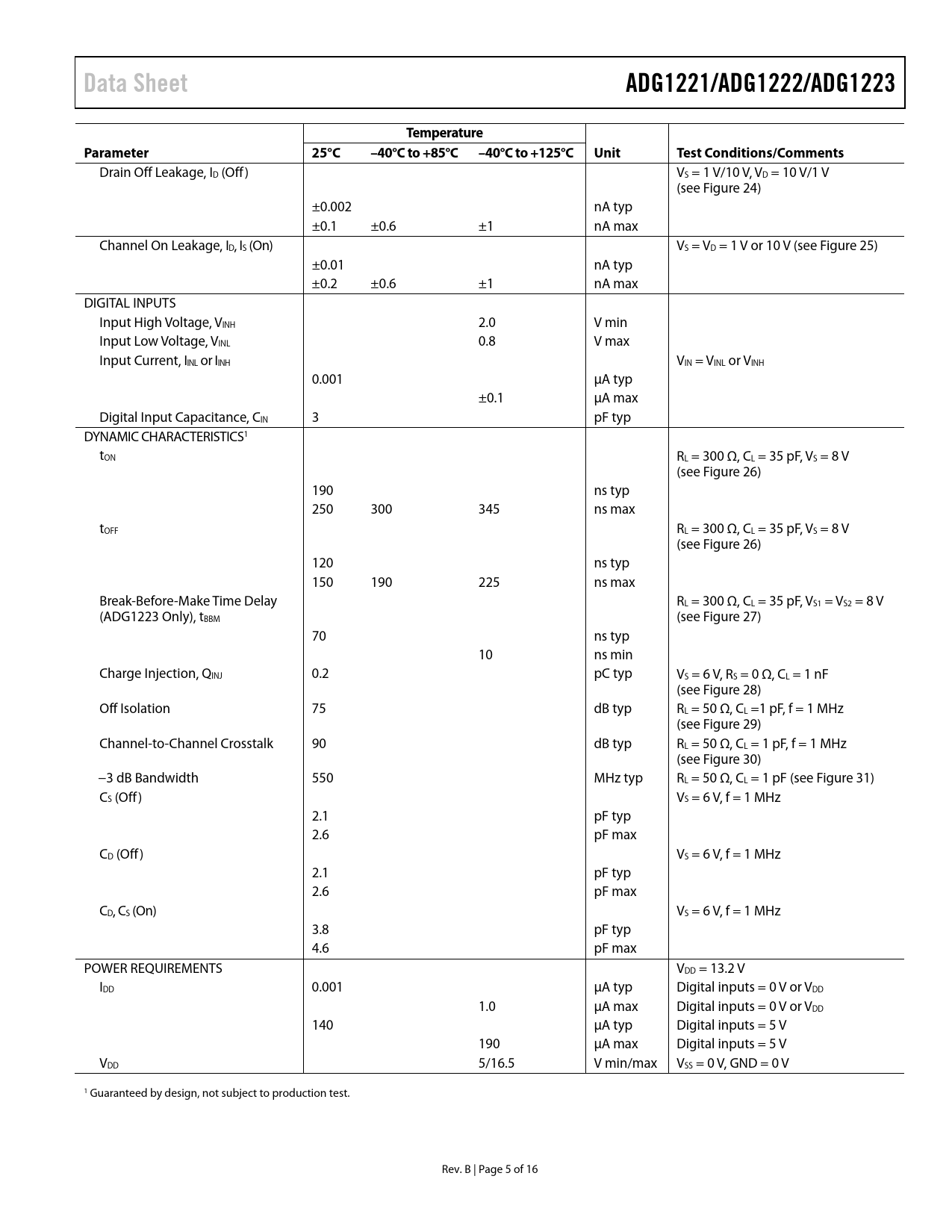 Data Sheet. ADG1221/ADG1222/ADG1223. Temperature. Parameter. 25°C. –40°C to +85°C. –40°C to +125°C. Unit. Test Conditions/Comments