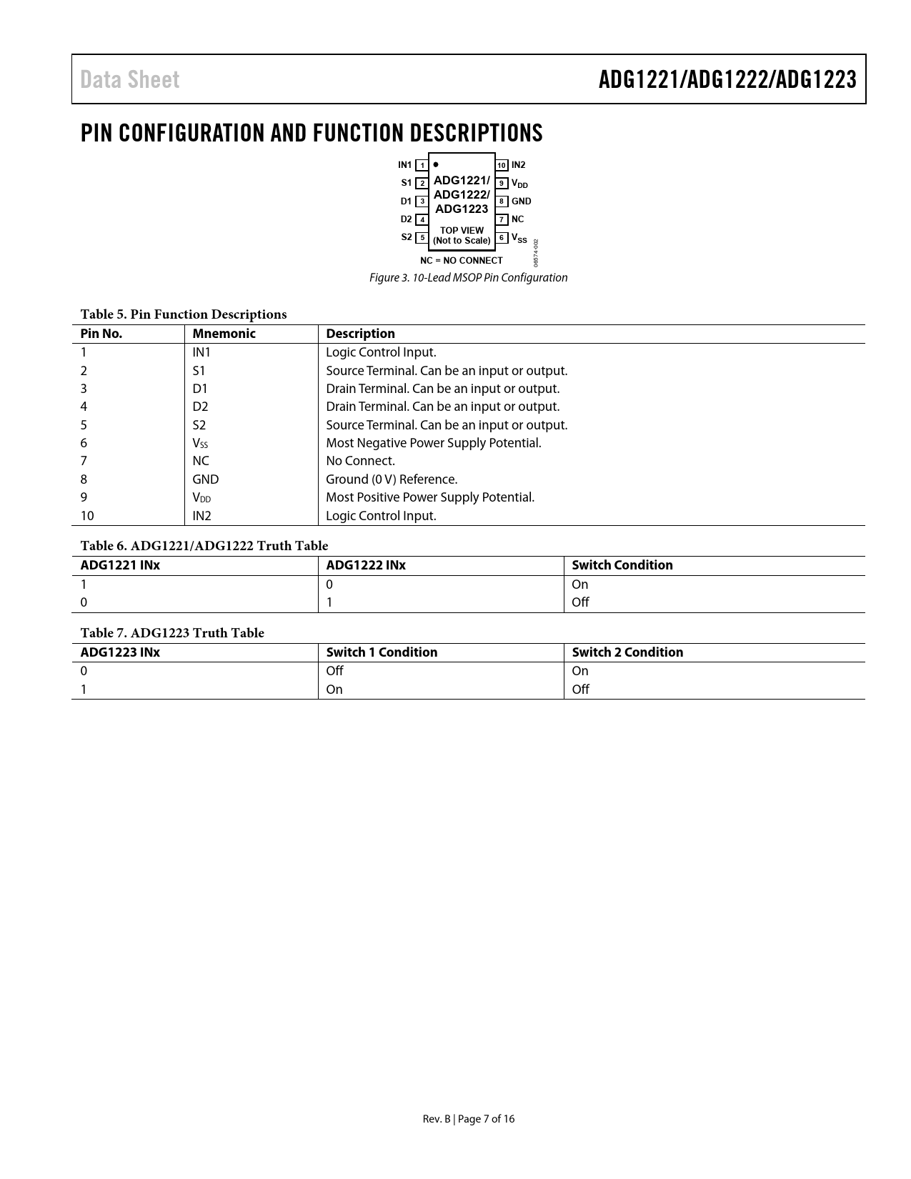 Páginas / Página16 / 7 — Data Sheet. ADG1221/ADG1222/ADG1223. PIN CONFIGURATION AND FUNCTION …
