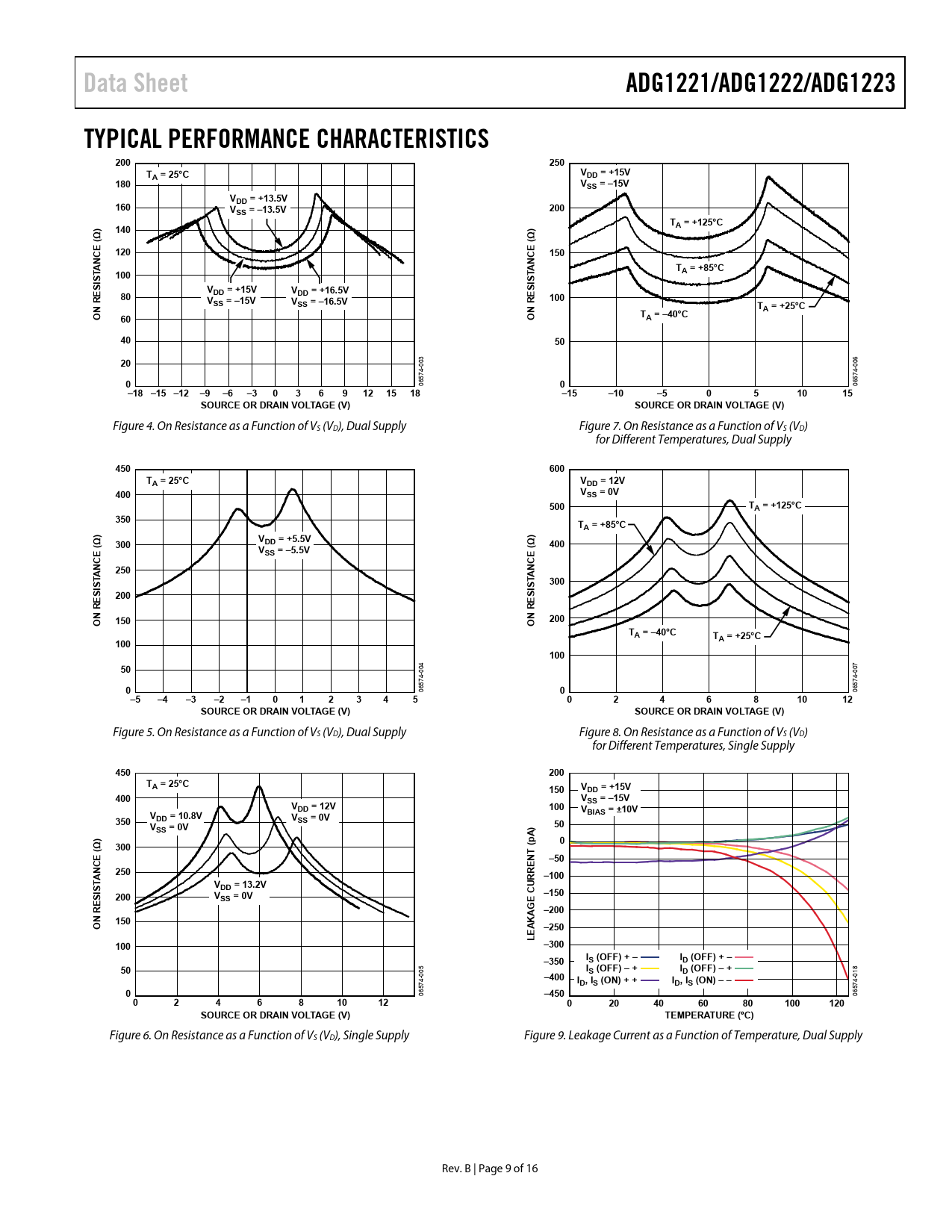 Data SheetADG1221/ADG1222/ADG1223TYPICAL PERFORMANCE CHARACTERISTICS200250TA = 25°CVDD = +15V180VSS = –15VV160DD = +13.5VVSS = –13.5V200)T140)A = +125°C(Ω(Ω120150T100A = +85°CSISTANCEVDD = +15VVSISTANCEDD = +16.5V80V100SS = –15VVSS = –16.5VN REN RETA = +25°CO60OTA = –40°C405020 003 006 0 06574- 0 06574- –18 –15 –12 –9 –6–30369121518–15–10–5051015SOURCE OR DRAIN VOLTAGE (V)SOURCE OR DRAIN VOLTAGE (V) Figure 4. On Resistance as a Function of VS (VD), Dual Supply Figure 7. On Resistance as a Function of VS (VD) for Different Temperatures, Dual Supply 450600TA = 25°CVDD = 12V400VSS = 0V500TA = +125°C350TA = +85°C)V)(Ω300DD = +5.5VV400SS = –5.5V(Ω250300SISTANCE200SISTANCEN REN REO150O200TA = –40°CT100A = +25°C10050 004 007 0 06574- 0 06574- –5–4–3–2–1012345024681012SOURCE OR DRAIN VOLTAGE (V)SOURCE OR DRAIN VOLTAGE (V) Figure 5. On Resistance as a Function of VS (VD), Dual Supply Figure 8. On Resistance as a Function of VS (VD) for Different Temperatures, Single Supply 450200TA = 25°C150VDD = +15V400VVSS = –15VDD = 12V100VBIAS = ±10V350VDD = 10.8VVSS = 0VV50SS = 0V) (Ω300(pA)0NT–50250–100VDD = 13.2VSISTANCE200V–150SS = 0VE CURRE –200N RE O150–250LEAKAG100–300 –350IS (OFF) + –ID (OFF) + –50I 005 –400S (OFF) – +ID (OFF) – + 018 ID, IS (ON) + +ID, IS (ON) – –0 06574- –450 06574- 024681012020406080100120SOURCE OR DRAIN VOLTAGE (V)TEMPERATURE (ºC) Figure 6. On Resistance as a Function of VS (VD), Single Supply Figure 9. Leakage Current as a Function of Temperature, Dual Supply Rev. B | Page 9 of 16 Document Outline FEATURES APPLICATIONS FUNCTIONAL BLOCK DIAGRAM GENERAL DESCRIPTION REVISION HISTORY SPECIFICATIONS DUAL SUPPLY SINGLE SUPPLY ABSOLUTE MAXIMUM RATINGS THERMAL RESISTANCE ESD CAUTION PIN CONFIGURATION AND FUNCTION DESCRIPTIONS TERMINOLOGY TYPICAL PERFORMANCE CHARACTERISTICS TEST CIRCUITS OUTLINE DIMENSIONS ORDERING GUIDE