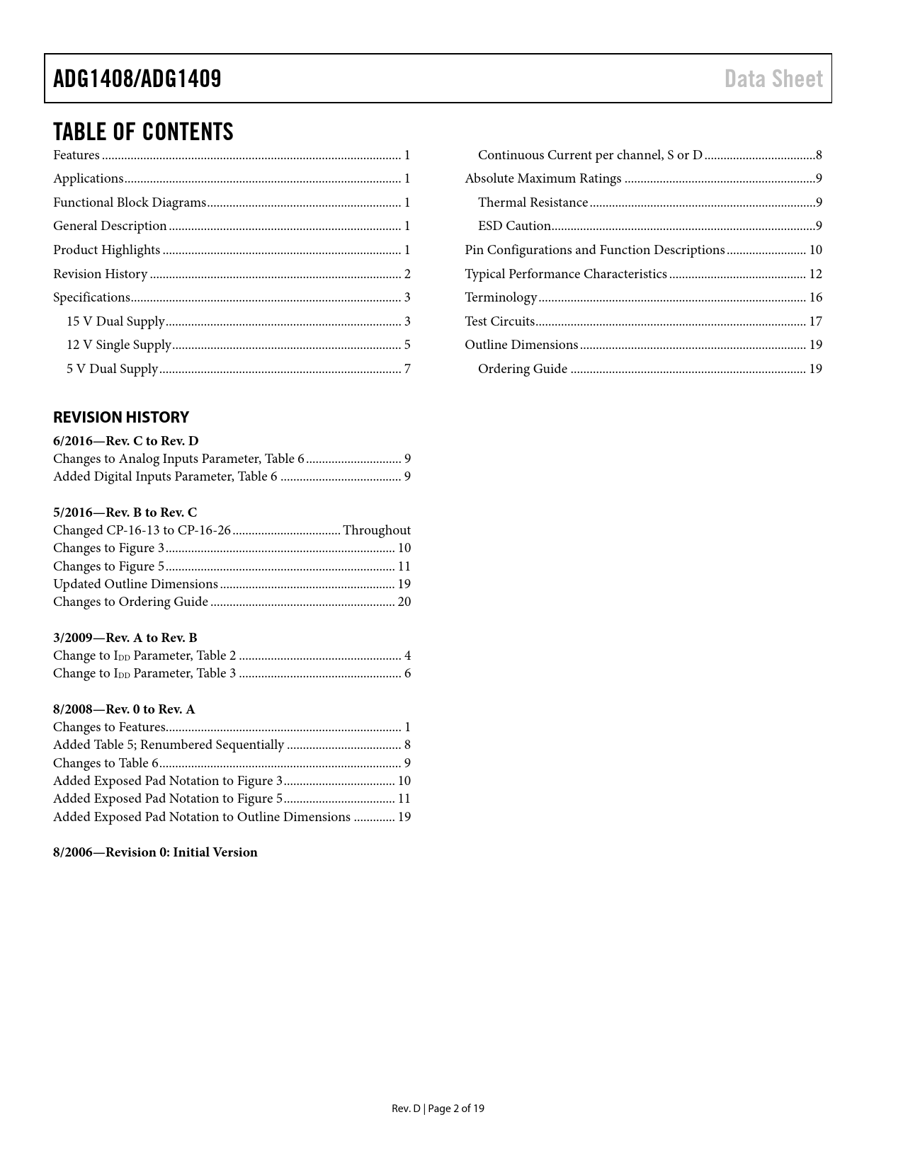 ADG1408/ADG1409 Data Sheet TABLE OF CONTENTS REVISION HISTORY 6/2016—Rev C to Rev D 5/2016—Rev B to Rev C