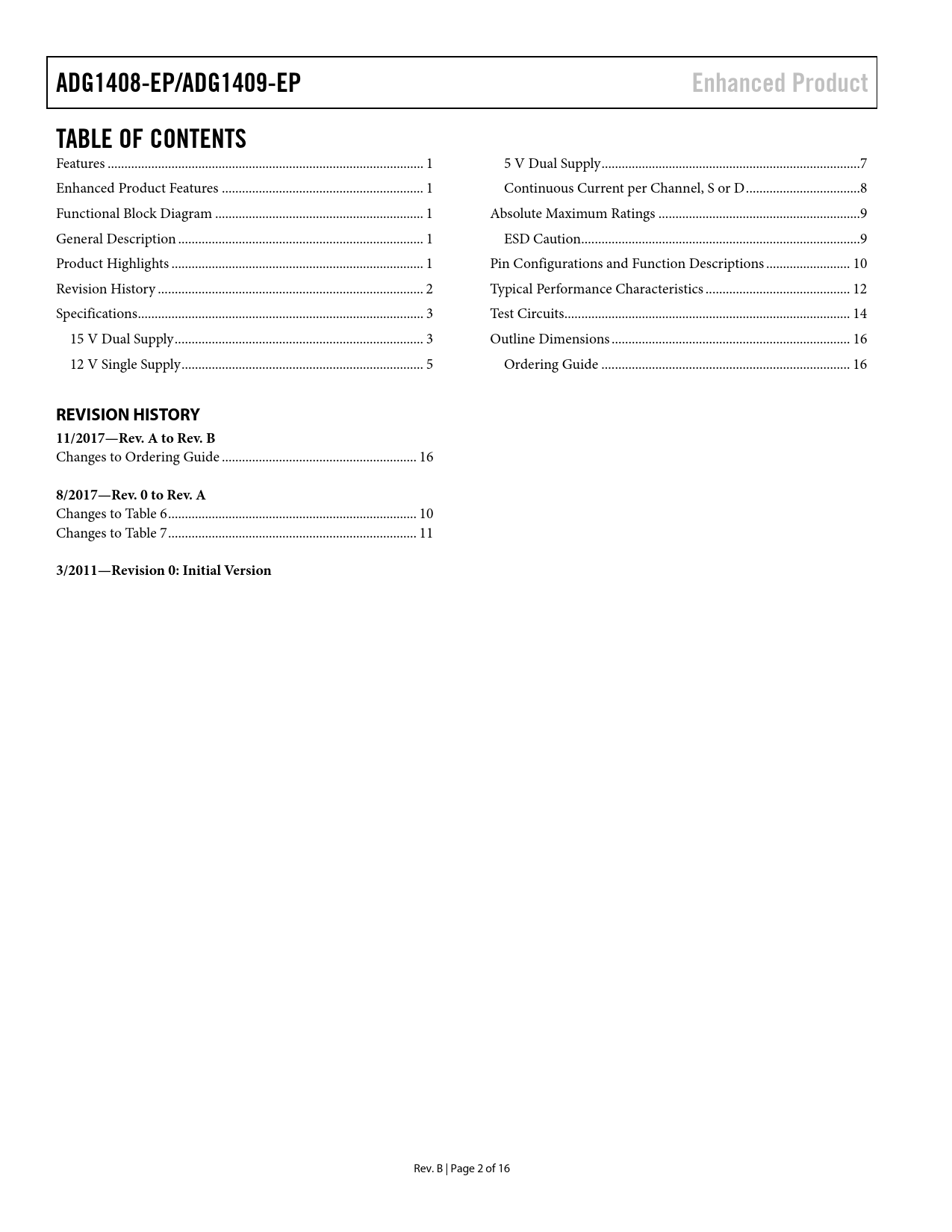 link to page 1 link to page 1 link to page 1 link to page 1 link to page 1 link to page 2 link to page 3 link to page 3 link to page 5 link to page 7 link to page 8 link to page 9 link to page 9 link to page 10 link to page 12 link to page 14 link to page 16 link to page 16 ADG1408-EP/ADG1409-EPEnhanced ProductTABLE OF CONTENTS Features .. 1 5 V Dual Supply ...7 Enhanced Product Features .. 1 Continuous Current per Channel, S or D ..8 Functional Block Diagram .. 1 Absolute Maximum Ratings ..9 General Description ... 1 ESD Caution...9 Product Highlights ... 1 Pin Configurations and Function Descriptions ... 10 Revision History ... 2 Typical Performance Characteristics ... 12 Specifications ... 3 Test Circuits ... 14 15 V Dual Supply .. 3 Outline Dimensions ... 16 12 V Single Supply .. 5 Ordering Guide .. 16 REVISION HISTORY 11/2017—Rev. A to Rev. B Changes to Ordering Guide .. 16 8/2017—Rev. 0 to Rev. A Changes to Table 6 .. 10 Changes to Table 7 .. 11 3/2011—Revision 0: Initial Version Rev. B | Page 2 of 16 Document Outline FEATURES ENHANCED PRODUCT FEATURES FUNCTIONAL BLOCK DIAGRAM GENERAL DESCRIPTION PRODUCT HIGHLIGHTS TABLE OF CONTENTS REVISION HISTORY SPECIFICATIONS 15 V DUAL SUPPLY 12 V SINGLE SUPPLY 5 V DUAL SUPPLY CONTINUOUS CURRENT PER CHANNEL, S OR D ABSOLUTE MAXIMUM RATINGS ESD CAUTION PIN CONFIGURATIONS AND FUNCTION DESCRIPTIONS TYPICAL PERFORMANCE CHARACTERISTICS TEST CIRCUITS OUTLINE DIMENSIONS ORDERING GUIDE