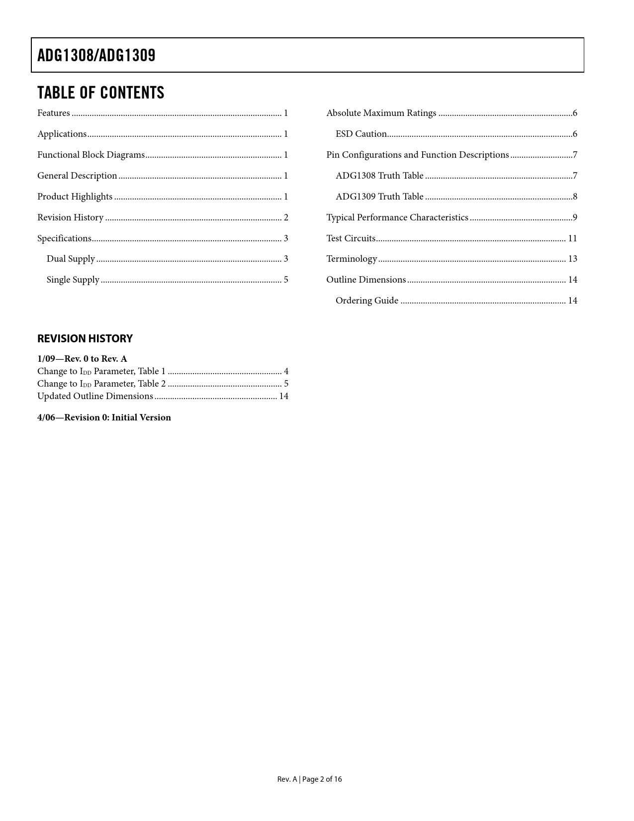 link to page 1 link to page 1 link to page 1 link to page 1 link to page 1 link to page 2 link to page 3 link to page 3 link to page 5 link to page 6 link to page 6 link to page 7 link to page 7 link to page 8 link to page 9 link to page 11 link to page 13 link to page 14 link to page 14 ADG1308/ADG1309TABLE OF CONTENTS Features .. 1 Absolute Maximum Ratings ..6 Applications ... 1 ESD Caution...6 Functional Block Diagrams ... 1 Pin Configurations and Function Descriptions ..7 General Description ... 1 ADG1308 Truth Table ..7 Product Highlights ... 1 ADG1309 Truth Table ..8 Revision History ... 2 Typical Performance Characteristics ..9 Specifications ... 3 Test Circuits ... 11 Dual Supply ... 3 Terminology .. 13 Single Supply ... 5 Outline Dimensions ... 14 Ordering Guide .. 14 REVISION HISTORY1/09—Rev. 0 to Rev. A Change to IDD Parameter, Table 1 ... 4 Change to IDD Parameter, Table 2 ... 5 Updated Outline Dimensions ... 14 4/06—Revision 0: Initial Version Rev. A | Page 2 of 16 Document Outline FEATURES APPLICATIONS FUNCTIONAL BLOCK DIAGRAMS GENERAL DESCRIPTION PRODUCT HIGHLIGHTS TABLE OF CONTENTS REVISION HISTORY SPECIFICATIONS DUAL SUPPLY SINGLE SUPPLY ABSOLUTE MAXIMUM RATINGS ESD CAUTION PIN CONFIGURATIONS AND FUNCTION DESCRIPTIONS ADG1308 TRUTH TABLE ADG1309 TRUTH TABLE TYPICAL PERFORMANCE CHARACTERISTICS TEST CIRCUITS TERMINOLOGY OUTLINE DIMENSIONS ORDERING GUIDE
