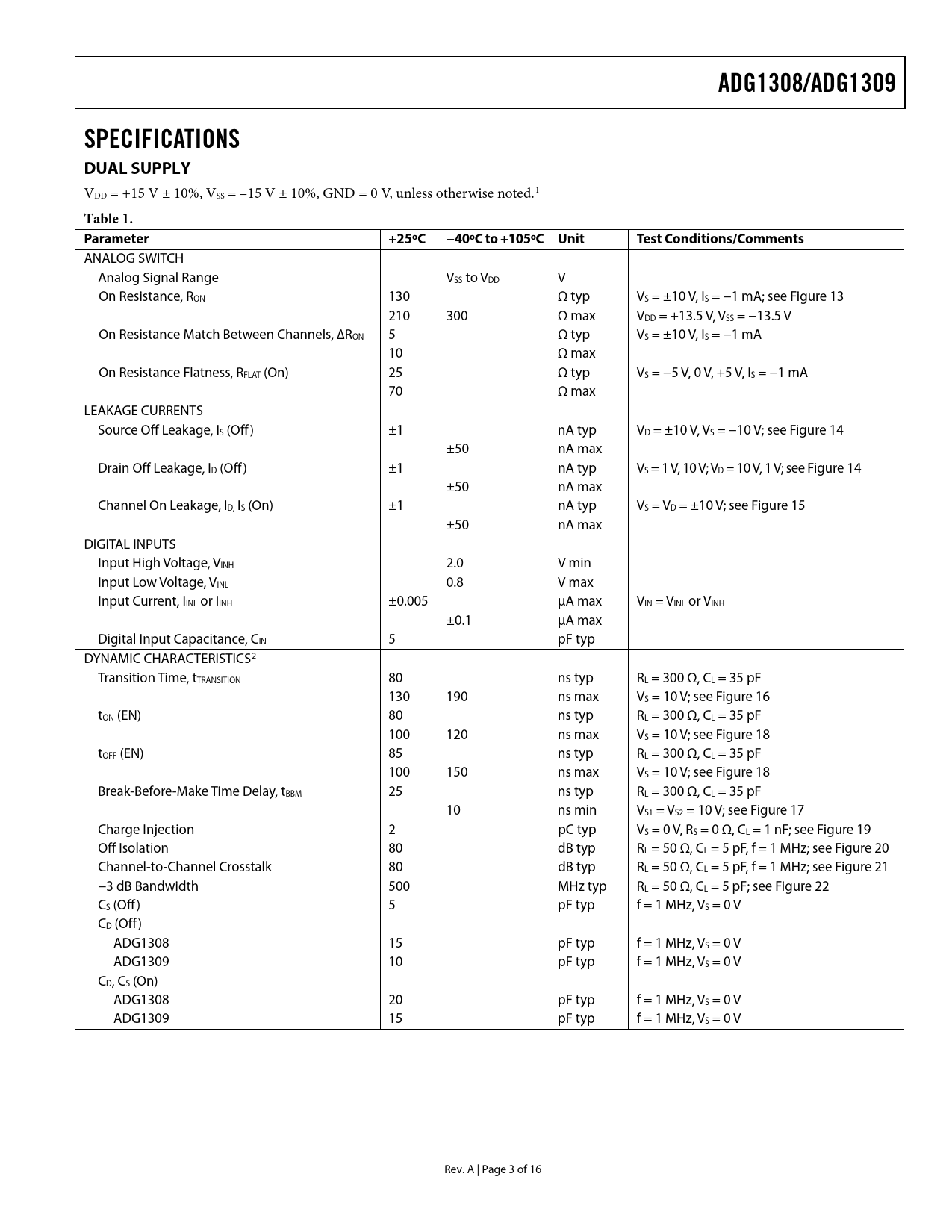 link to page 11 link to page 11 link to page 11 link to page 11 link to page 11 link to page 11 link to page 11 link to page 12 link to page 12 link to page 12 link to page 12 link to page 4 link to page 4 link to page 11 ADG1308/ADG1309SPECIFICATIONS DUAL SUPPLY VDD = +15 V ± 10%, VSS = –15 V ± 10%, GND = 0 V, unless otherwise noted.1 Table 1. Parameter+25ºC−40ºC to +105ºCUnitTest Conditions/Comments ANALOG SWITCH Analog Signal Range VSS to VDD V On Resistance, RON 130 Ω typ VS = ±10 V, IS = −1 mA; see Figure 13 210 300 Ω max VDD = +13.5 V, VSS = −13.5 V On Resistance Match Between Channels, ∆RON 5 Ω typ VS = ±10 V, IS = −1 mA 10 Ω max On Resistance Flatness, RFLAT (On) 25 Ω typ VS = −5 V, 0 V, +5 V, IS = −1 mA 70 Ω max LEAKAGE CURRENTS Source Off Leakage, IS (Off ) ±1 nA typ VD = ±10 V, VS = −10 V; see Figure 14 ±50 nA max Drain Off Leakage, ID (Off ) ±1 nA typ VS = 1 V, 10 V; VD = 10 V, 1 V; see Figure 14 ±50 nA max Channel On Leakage, ID, IS (On) ±1 nA typ VS = VD = ±10 V; see Figure 15 ±50 nA max DIGITAL INPUTS Input High Voltage, VINH 2.0 V min Input Low Voltage, VINL 0.8 V max Input Current, IINL or IINH ±0.005 μA max VIN = VINL or VINH ±0.1 μA max Digital Input Capacitance, CIN 5 pF typ DYNAMIC CHARACTERISTICS2 Transition Time, tTRANSITION 80 ns typ RL = 300 Ω, CL = 35 pF 130 190 ns max VS = 10 V; see Figure 16 tON (EN) 80 ns typ RL = 300 Ω, CL = 35 pF 100 120 ns max VS = 10 V; see Figure 18 tOFF (EN) 85 ns typ RL = 300 Ω, CL = 35 pF 100 150 ns max VS = 10 V; see Figure 18 Break-Before-Make Time Delay, tBBM 25 ns typ RL = 300 Ω, CL = 35 pF 10 ns min VS1 = VS2 = 10 V; see Figure 17 Charge Injection 2 pC typ VS = 0 V, RS = 0 Ω, CL = 1 nF; see Figure 19 Off Isolation 80 dB typ RL = 50 Ω, CL = 5 pF, f = 1 MHz; see Figure 20 Channel-to-Channel Crosstalk 80 dB typ RL = 50 Ω, CL = 5 pF, f = 1 MHz; see Figure 21 −3 dB Bandwidth 500 MHz typ RL = 50 Ω, CL = 5 pF; see Figure 22 CS (Off ) 5 pF typ f = 1 MHz, VS = 0 V CD (Off ) ADG1308 15 pF typ f = 1 MHz, VS = 0 V ADG1309 10 pF typ f = 1 MHz, VS = 0 V CD, CS (On) ADG1308 20 pF typ f = 1 MHz, VS = 0 V ADG1309 15 pF typ f = 1 MHz, VS = 0 V Rev. A | Page 3 of 16 Document Outline FEATURES APPLICATIONS FUNCTIONAL BLOCK DIAGRAMS GENERAL DESCRIPTION PRODUCT HIGHLIGHTS TABLE OF CONTENTS REVISION HISTORY SPECIFICATIONS DUAL SUPPLY SINGLE SUPPLY ABSOLUTE MAXIMUM RATINGS ESD CAUTION PIN CONFIGURATIONS AND FUNCTION DESCRIPTIONS ADG1308 TRUTH TABLE ADG1309 TRUTH TABLE TYPICAL PERFORMANCE CHARACTERISTICS TEST CIRCUITS TERMINOLOGY OUTLINE DIMENSIONS ORDERING GUIDE