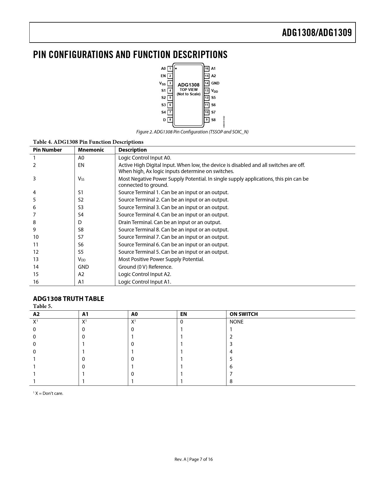 ADG1308/ADG1309 PIN CONFIGURATIONS AND FUNCTION DESCRIPTIONS A0 1 16 A1 EN 2 15 A2 V 3 14 SS GND ADG1308 S1 4 TOP VIEW 13 VDD (Not to Scale) S2 5 12 S5 S3 6 11 S6 S4 7 10 S7