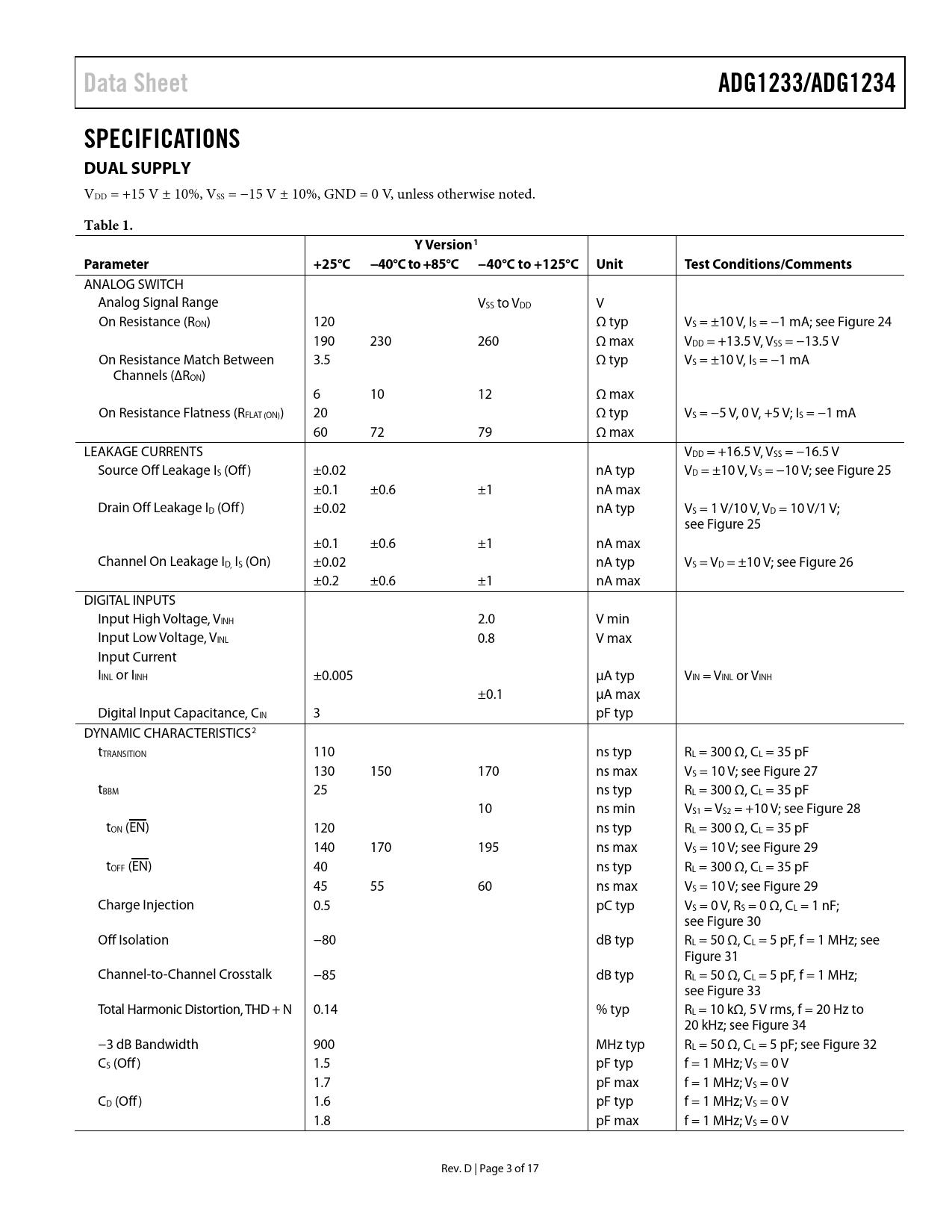 Páginas / Página17 / 3 — Data Sheet. ADG1233/ADG1234. SPECIFICATIONS DUAL SUPPLY. Table 1. Y …