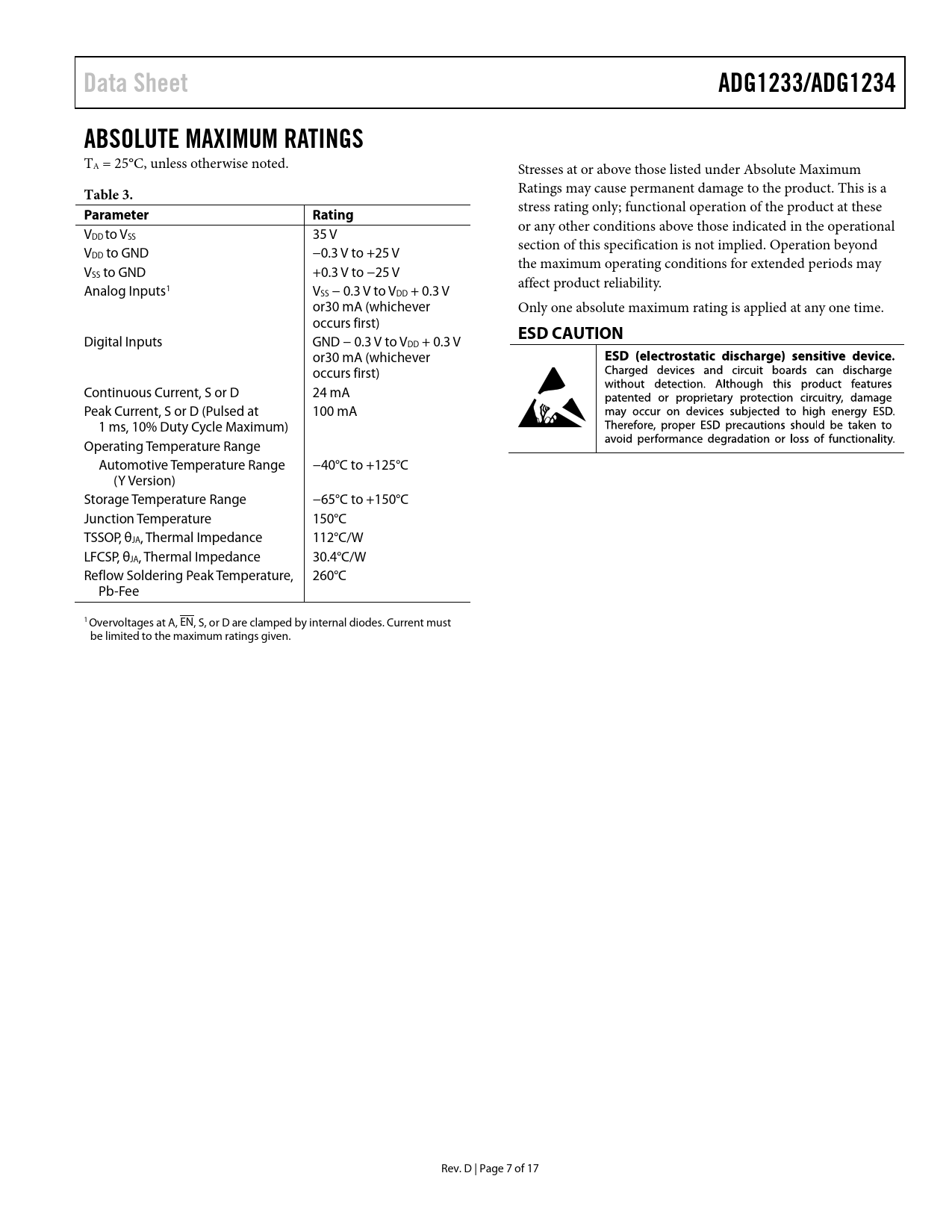 Data Sheet. ADG1233/ADG1234. ABSOLUTE MAXIMUM RATINGS. Table 3. Parameter. Rating. ESD CAUTION