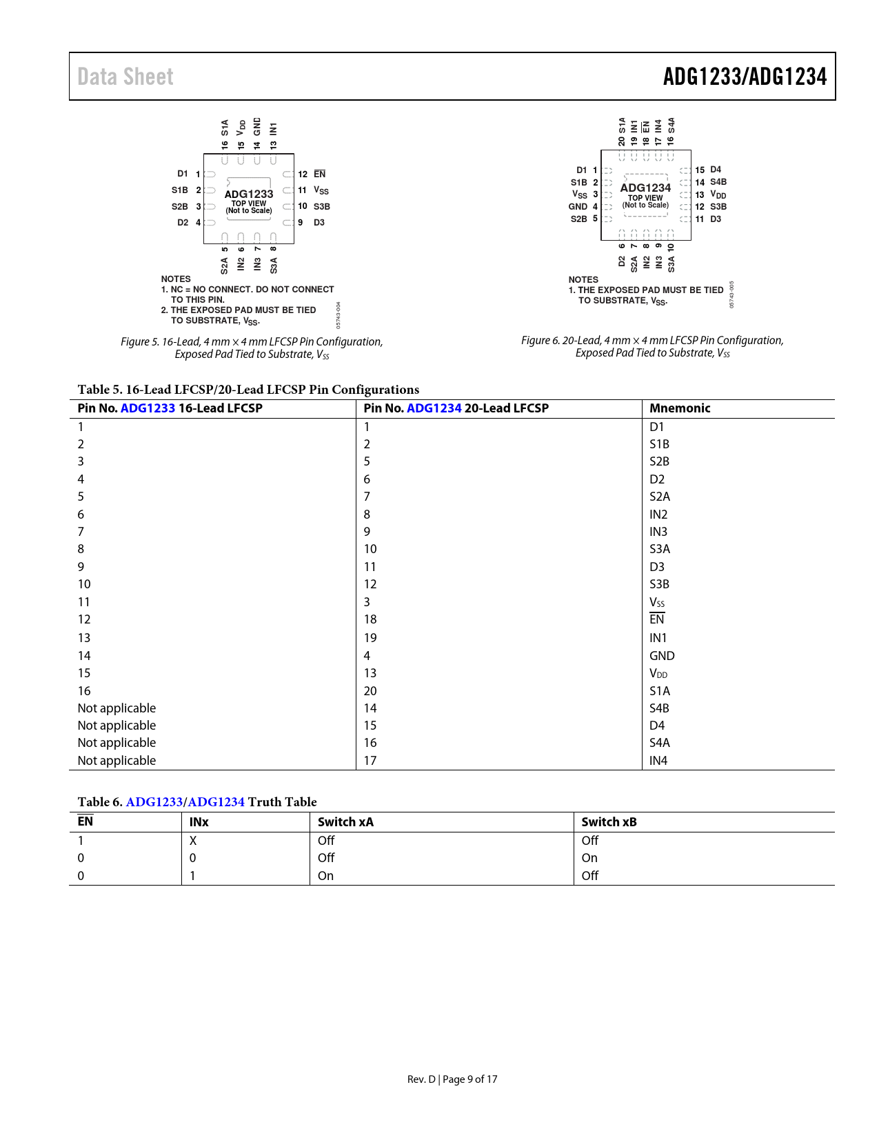 Table 5. 16-Lead LFCSP/20-Lead LFCSP Pin Configurations Pin No. ADG1233 1 6-Lead LFCSP Pin No. ADG1234 20-Lead LFCSP Mnemonic