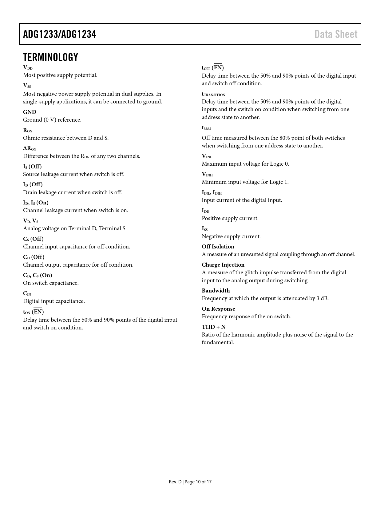 Páginas / Página17 / 10 — ADG1233/ADG1234. Data Sheet. TERMINOLOGY VDD. tOFF (EN). tTRANSITION. …