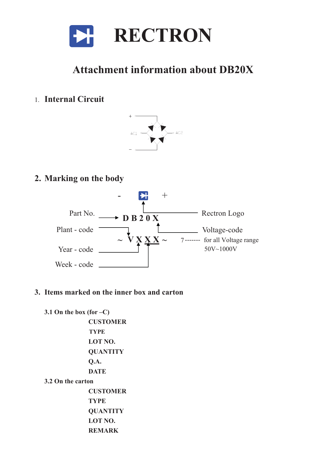 RECTRON. Attachment information about DB20X. Internal Circuit. 2. Marking on the body. D B 2 0 X. ~ V X X X ~