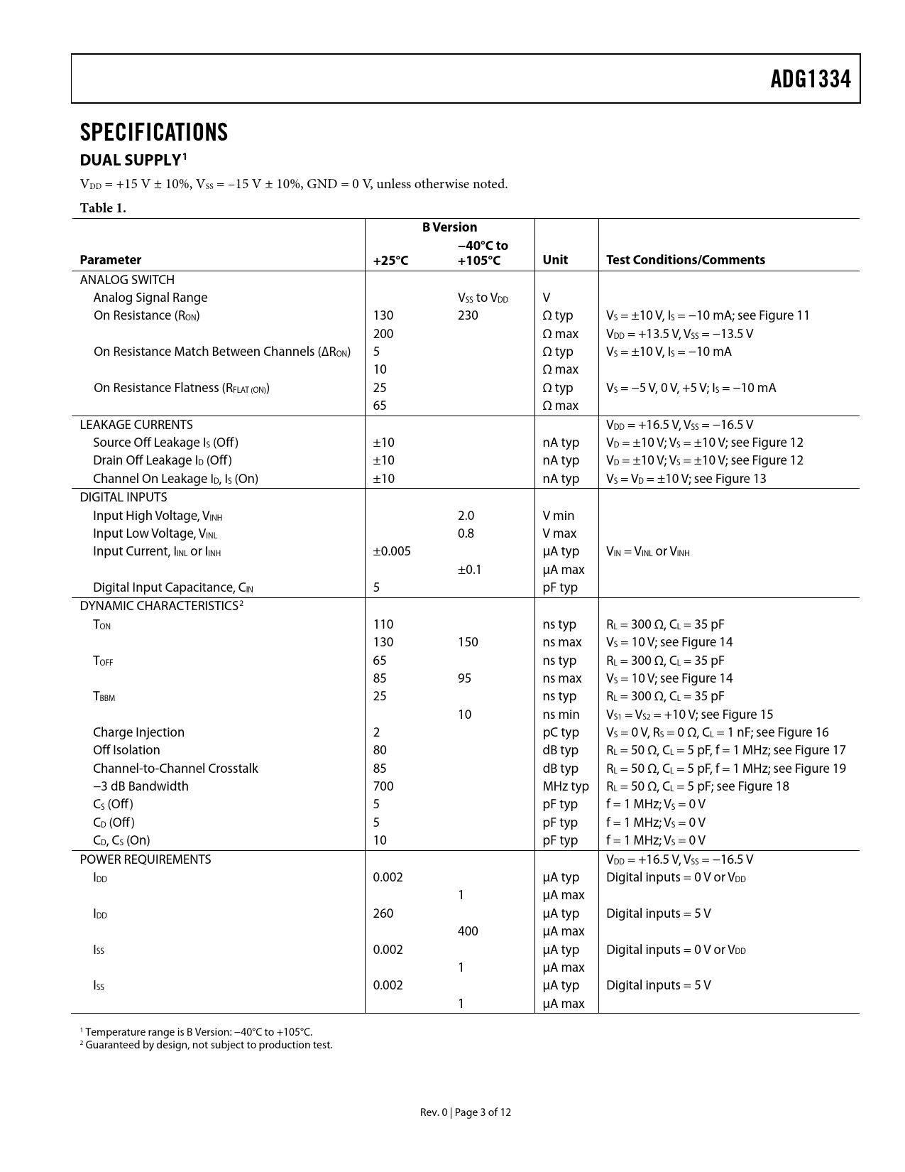 ADG1334. SPECIFICATIONS DUAL SUPPLY1. Table 1. B Version. −40°C to. Parameter. +25°C. +105°C. Unit. Test Conditions/Comments
