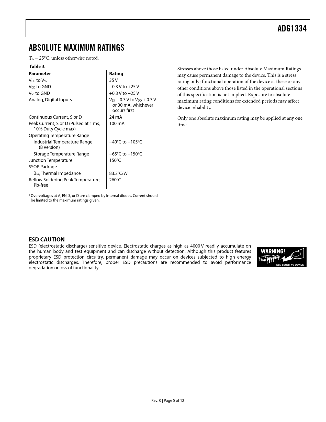 Páginas / Página12 / 5 — ADG1334. ABSOLUTE MAXIMUM RATINGS. Table 3. Parameter Rating. ESD CAUTION
