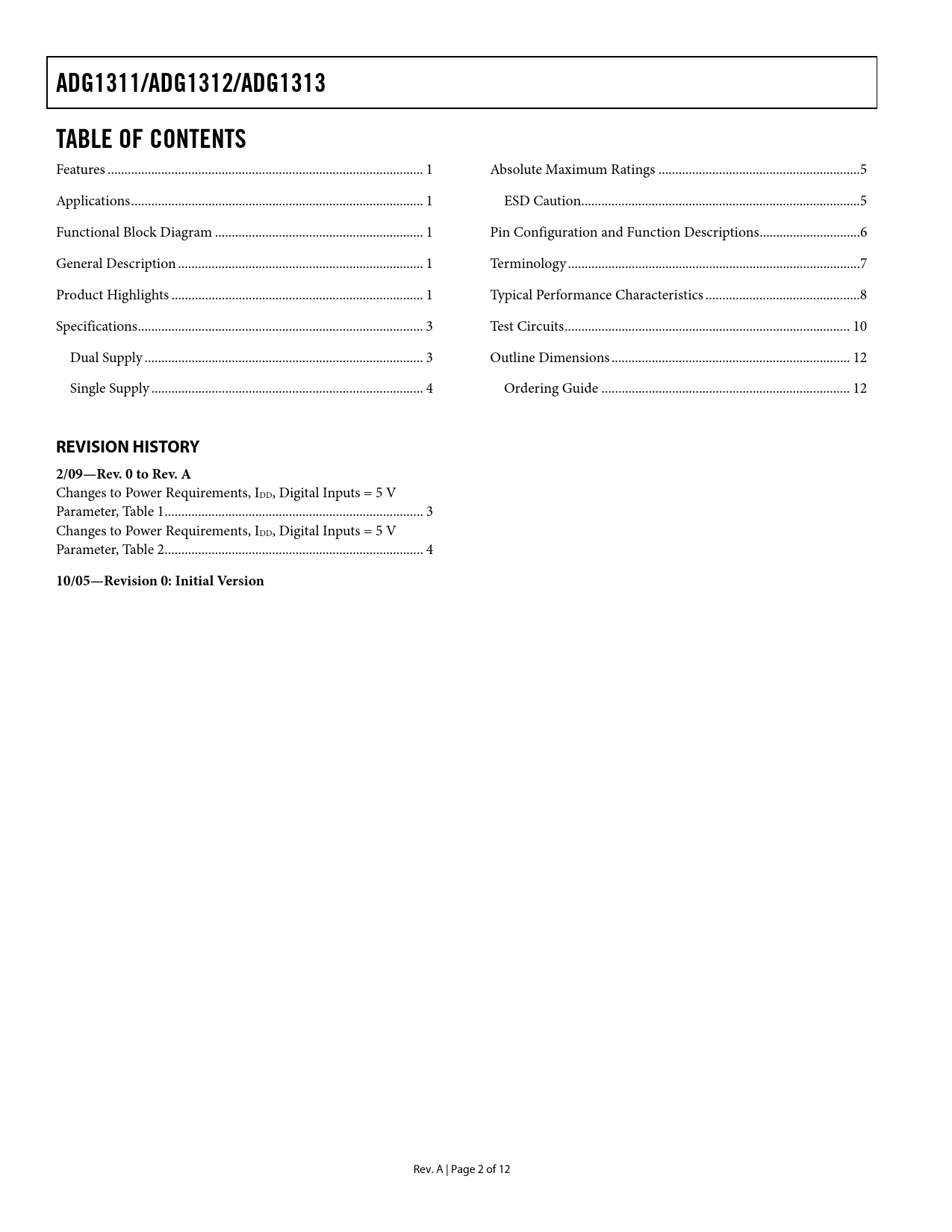 link to page 1 link to page 1 link to page 1 link to page 1 link to page 1 link to page 3 link to page 3 link to page 4 link to page 5 link to page 5 link to page 6 link to page 7 link to page 8 link to page 10 link to page 12 link to page 12 ADG1311/ADG1312/ADG1313TABLE OF CONTENTS Features .. 1 Absolute Maximum Ratings ..5 Applications ... 1 ESD Caution...5 Functional Block Diagram .. 1 Pin Configuration and Function Descriptions ..6 General Description ... 1 Terminology ...7 Product Highlights ... 1 Typical Performance Characteristics ..8 Specifications ... 3 Test Circuits ... 10 Dual Supply ... 3 Outline Dimensions ... 12 Single Supply ... 4 Ordering Guide .. 12 REVISION HISTORY2/09—Rev. 0 to Rev. A Changes to Power Requirements, IDD, Digital Inputs = 5 V Parameter, Table 1 ... 3 Changes to Power Requirements, IDD, Digital Inputs = 5 V Parameter, Table 2 ... 4 10/05—Revision 0: Initial Version Rev. A | Page 2 of 12 Document Outline FEATURES APPLICATIONS GENERAL DESCRIPTION FUNCTIONAL BLOCK DIAGRAM PRODUCT HIGHLIGHTS TABLE OF CONTENTS REVISION HISTORY SPECIFICATIONS DUAL SUPPLY SINGLE SUPPLY ABSOLUTE MAXIMUM RATINGS ESD CAUTION PIN CONFIGURATION AND FUNCTION DESCRIPTIONS TERMINOLOGY TYPICAL PERFORMANCE CHARACTERISTICS TEST CIRCUITS OUTLINE DIMENSIONS ORDERING GUIDE