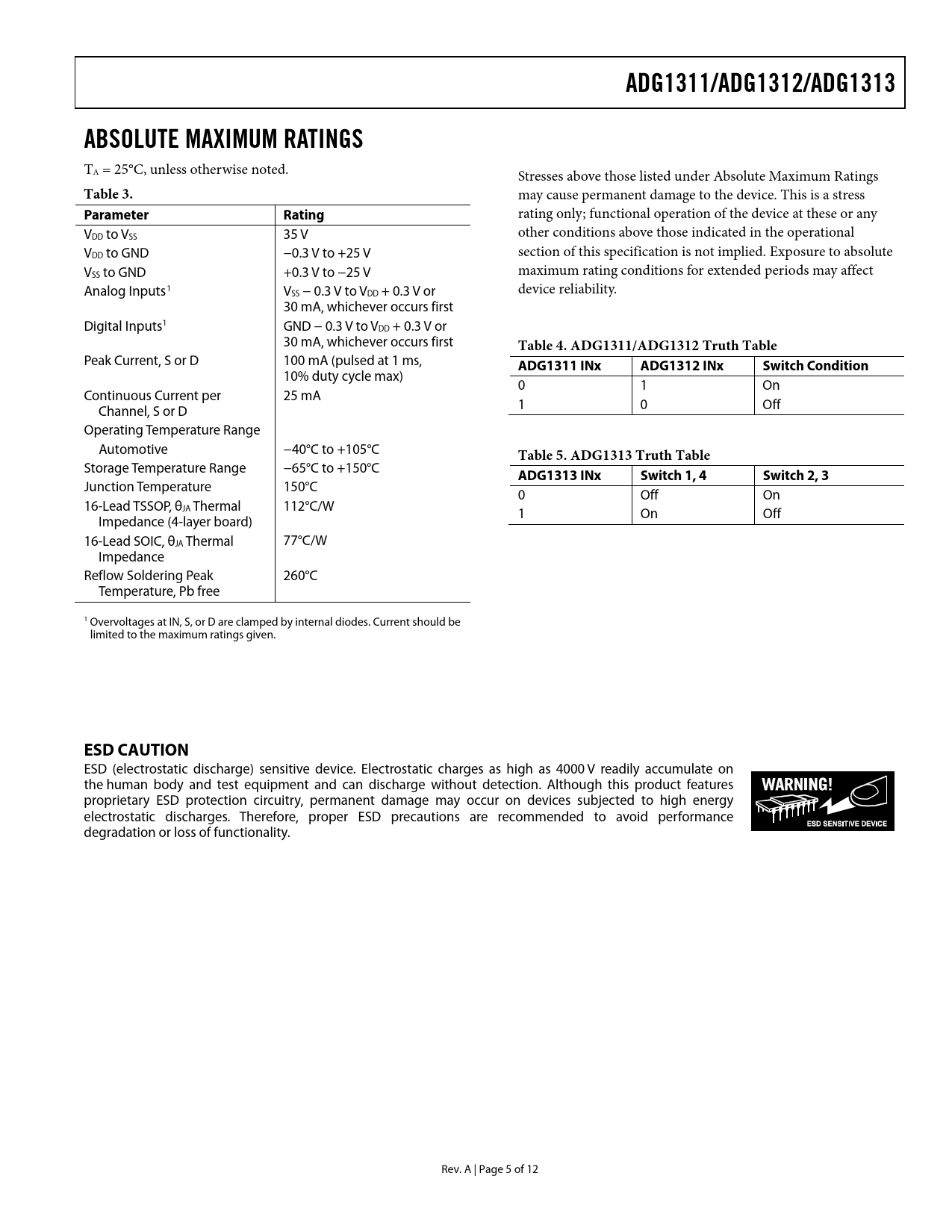 ADG1311/ADG1312/ADG1313. ABSOLUTE MAXIMUM RATINGS. Table 3. Parameter Rating. Table 4. ADG1311/ADG1312 Truth Table. ADG1311 INx