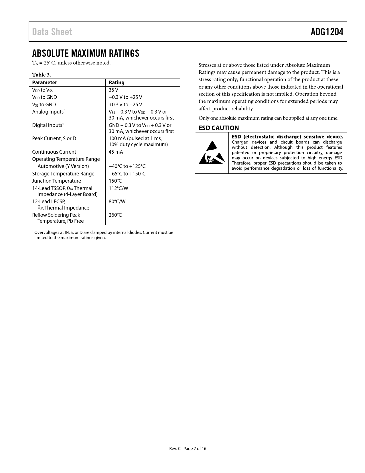Data Sheet ADG1204 ABSOLUTE MAXIMUM RATINGS Table 3 Parameter Rating ESD CAUTION