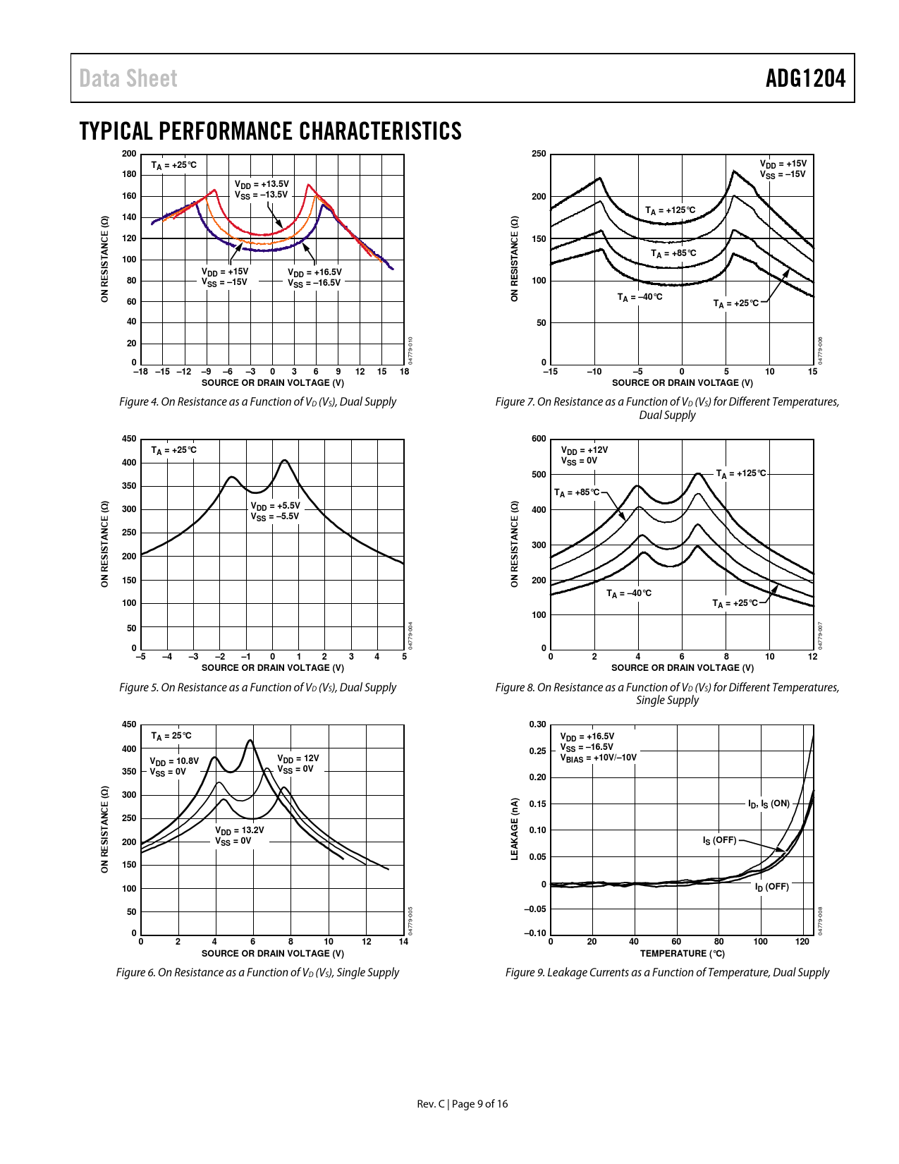 Data SheetADG1204TYPICAL PERFORMANCE CHARACTERISTICS200250TVA = +25°CDD = +15V180VSS = –15VVDD = +13.5V160VSS = –13.5V200)TA = +125°C140)(Ω(Ω120150ANCET100TA = +85°CSISTANCEISVDD = +15VVDD = +16.5VSRE80VSS = –15VV100SS = –16.5VNN REOT60OA = –40°CTA = +25°C405020 010 006 0 04779- 0 04779- –18 –15 –12–9–6–30369121518–15–10–5051015SOURCE OR DRAIN VOLTAGE (V)SOURCE OR DRAIN VOLTAGE (V) Figure 4. On Resistance as a Function of VD (VS), Dual Supply Figure 7. On Resistance as a Function of VD (VS) for Different Temperatures, Dual Supply 450600TA = +25°CVDD = +12V400VSS = 0V500TA = +125°C350T))A = +85°CV(Ω300DD = +5.5V(Ω400VSS = –5.5V250300SISTANCE200SISTANCERERENNO150O200TA = –40°C100TA = +25°C10050 004 007 0 04779- 0 04779- –5–4–3–2–1012345024681012SOURCE OR DRAIN VOLTAGE (V)SOURCE OR DRAIN VOLTAGE (V) Figure 5. On Resistance as a Function of VD (VS), Dual Supply Figure 8. On Resistance as a Function of VD (VS) for Different Temperatures, Single Supply 4500.30TA = 25°CVDD = +16.5V400V0.25SS = –16.5VVVVDD = 12VBIAS = +10V/–10VDD = 10.8V350VVSS = 0VSS = 0V0.20) (Ω300A)0.15InD, IS (ON)250( EVDD = 13.2V0.10200VSISTANCEISS = 0VS (OFF)AKAGREENL0.05O1500100ID (OFF)50–0.05 005 008 0 04779- –0.10 04779- 02468101214020406080100120SOURCE OR DRAIN VOLTAGE (V)TEMPERATURE (°C) Figure 6. On Resistance as a Function of VD (VS), Single Supply Figure 9. Leakage Currents as a Function of Temperature, Dual Supply Rev. C | Page 9 of 16 Document Outline FEATURES APPLICATIONS FUNCTIONAL BLOCK DIAGRAM GENERAL DESCRIPTION PRODUCT HIGHLIGHTS REVISION HISTORY SPECIFICATIONS DUAL SUPPLY SINGLE SUPPLY ABSOLUTE MAXIMUM RATINGS ESD CAUTION PIN CONFIGURATIONS AND FUNCTION DESCRIPTIONS TRUTH TABLE TYPICAL PERFORMANCE CHARACTERISTICS TEST CIRCUITS TERMINOLOGY OUTLINE DIMENSIONS ORDERING GUIDE