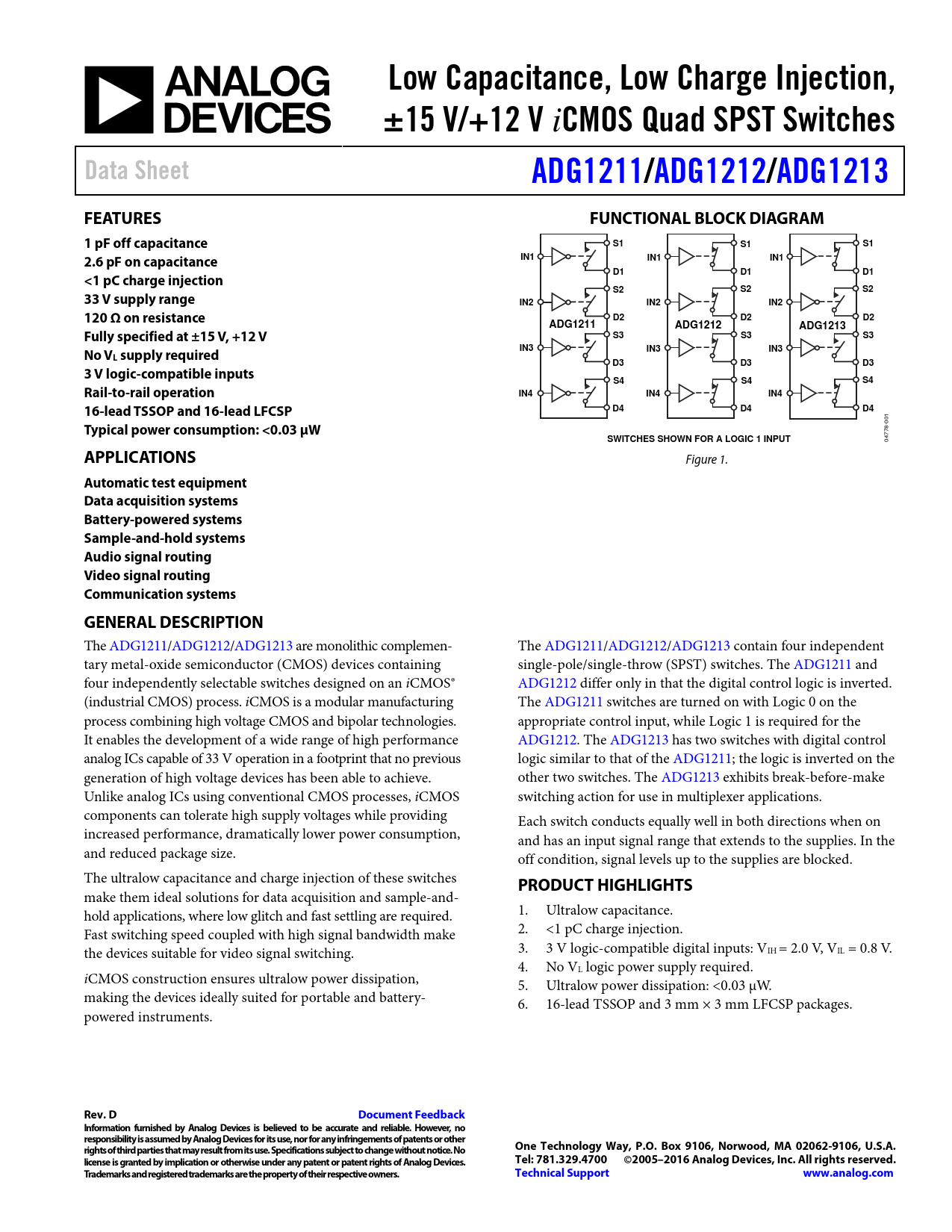 Low Capacitance, Low Charge Injection,. ±15 V/+12 V. CMOS Quad SPST Switches. Data Sheet. ADG1211/. ADG1212. /ADG1213. FEATURES