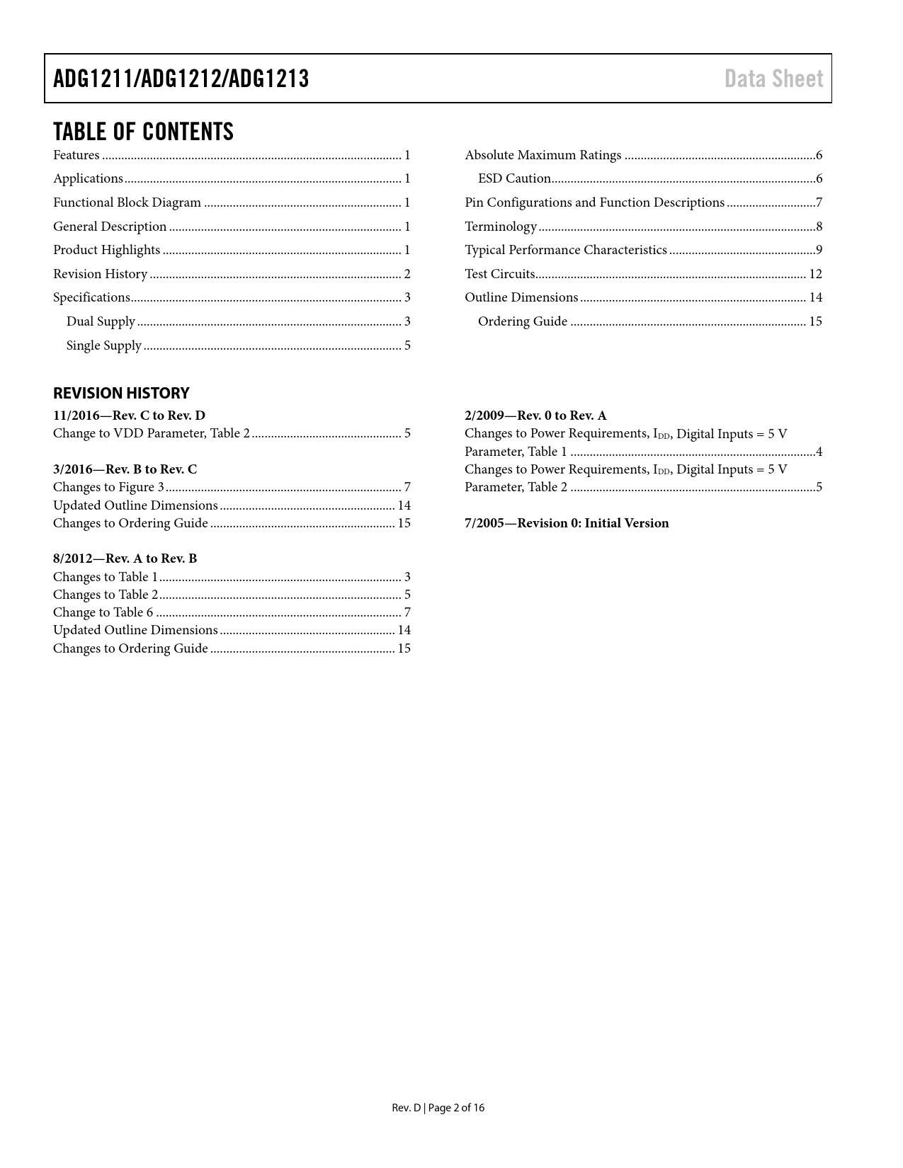 link to page 1 link to page 1 link to page 1 link to page 1 link to page 1 link to page 2 link to page 3 link to page 3 link to page 5 link to page 6 link to page 6 link to page 7 link to page 8 link to page 9 link to page 12 link to page 14 link to page 15 ADG1211/ADG1212/ADG1213Data SheetTABLE OF CONTENTS Features .. 1 Absolute Maximum Ratings ..6 Applications ... 1 ESD Caution...6 Functional Block Diagram .. 1 Pin Configurations and Function Descriptions ..7 General Description ... 1 Terminology ...8 Product Highlights ... 1 Typical Performance Characteristics ..9 Revision History ... 2 Test Circuits ... 12 Specifications ... 3 Outline Dimensions ... 14 Dual Supply ... 3 Ordering Guide .. 15 Single Supply ... 5 REVISION HISTORY 11/2016—Rev. C to Rev. D2/2009—Rev. 0 to Rev. A Change to VDD Parameter, Table 2 ... 5 Changes to Power Requirements, IDD, Digital Inputs = 5 V Parameter, Table 1 ... 4 3/2016—Rev. B to Rev. C Changes to Power Requirements, IDD, Digital Inputs = 5 V Changes to Figure 3 .. 7 Parameter, Table 2 ... 5 Updated Outline Dimensions ... 14 Changes to Ordering Guide .. 15 7/2005—Revision 0: Initial Version8/2012—Rev. A to Rev. B Changes to Table 1 .. 3 Changes to Table 2 .. 5 Change to Table 6 ... 7 Updated Outline Dimensions ... 14 Changes to Ordering Guide .. 15 Rev. D | Page 2 of 16 Document Outline FEATURES APPLICATIONS FUNCTIONAL BLOCK DIAGRAM GENERAL DESCRIPTION PRODUCT HIGHLIGHTS REVISION HISTORY SPECIFICATIONS DUAL SUPPLY SINGLE SUPPLY ABSOLUTE MAXIMUM RATINGS ESD CAUTION PIN CONFIGURATIONS AND FUNCTION DESCRIPTIONS TERMINOLOGY TYPICAL PERFORMANCE CHARACTERISTICS TEST CIRCUITS OUTLINE DIMENSIONS ORDERING GUIDE