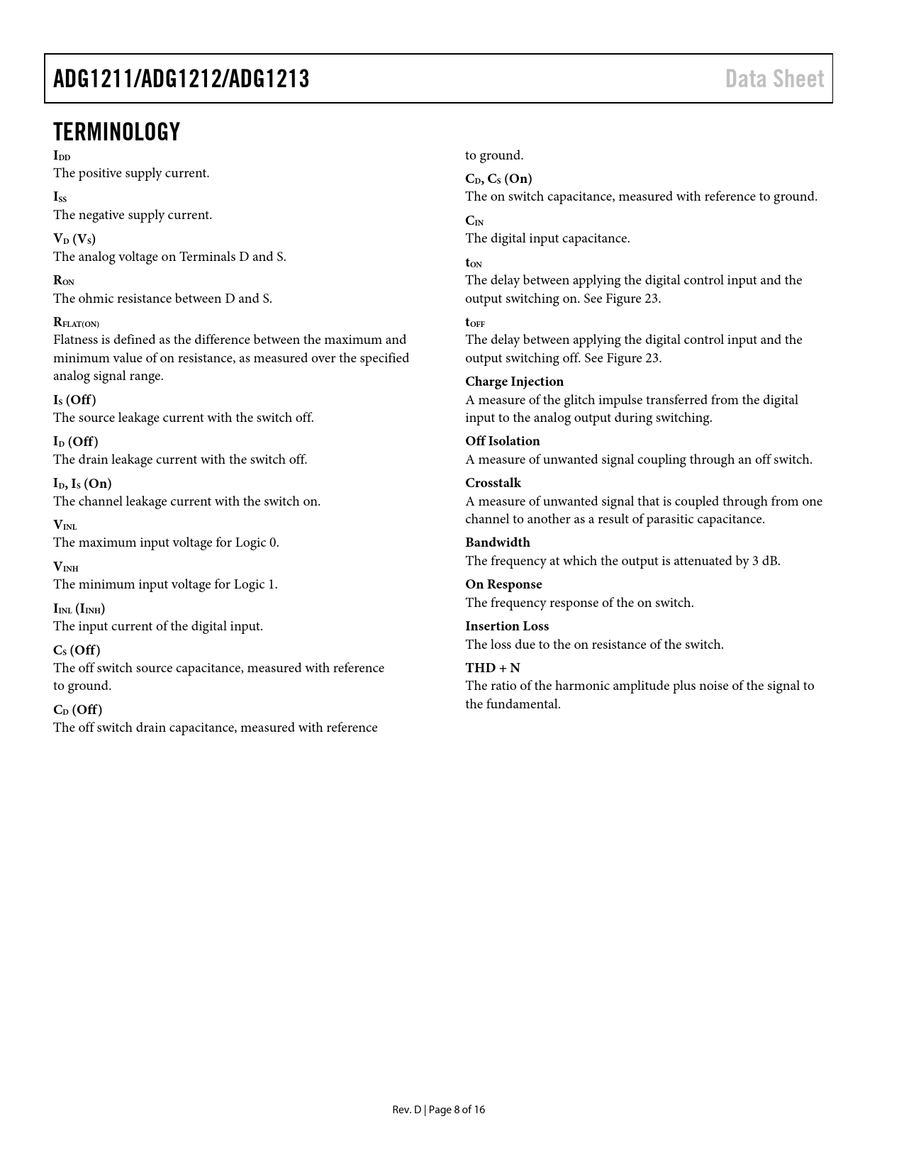 ADG1211/ADG1212/ADG1213. Data Sheet. TERMINOLOGY IDD. CD, CS (On). ISS. CIN. VD (VS). tON. RON. RFLAT(ON). tOFF. Charge Injection. IS (Off)