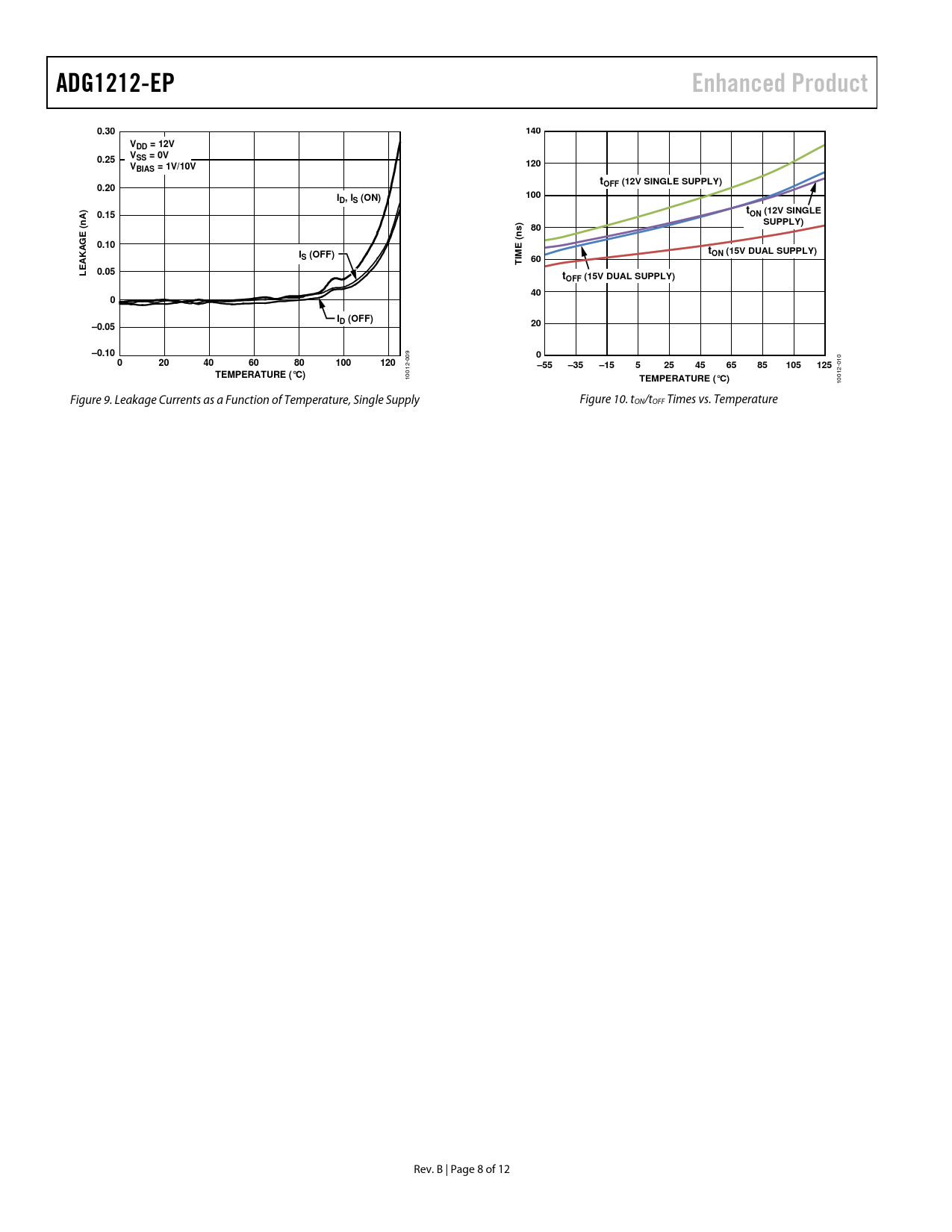 ADG1212-EPEnhanced Product0.30140VDD = 12V V0.25SS = 0VV120BIAS = 1V/10Vt0.20OFF (12V SINGLE SUPPLY)I100D, IS (ON)tA)0.15ON (12V SINGLEn)SUPPLY)(s80E0.10ItIME (nON (15V DUAL SUPPLY)AKAGS (OFF)60TE L0.05tOFF (15V DUAL SUPPLY)400ID (OFF)–0.0520–0.100020406080100120 009 –55–35–15525456585105125 010 TEMPERATURE (°C) 10012- TEMPERATURE (°C) 10012- Figure 9. Leakage Currents as a Function of Temperature, Single Supply Figure 10. tON/tOFF Times vs. Temperature Rev. B | Page 8 of 12 Document Outline Features Enhanced Product Features Applications General Description Functional Block Diagram Product Highlights Revision History Specifications Dual Supply Single Supply Absolute Maximum Ratings ESD Caution Pin Configuration and Function Descriptions Typical Performance Characteristics Test Circuits Outline Dimensions Ordering Guide
