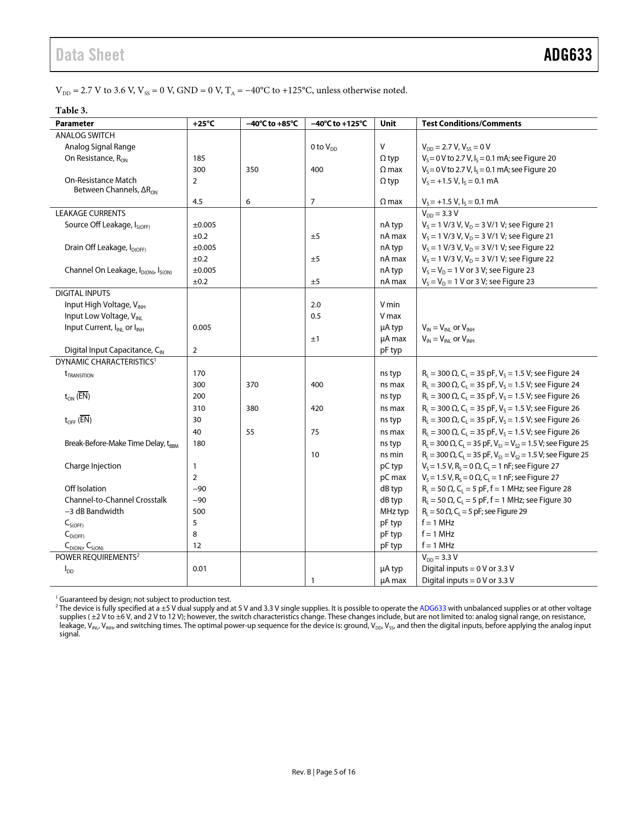 ANALOG SWITCH Analog Signal Range 0 to VDD V VDD = 2.7 V, VSS = 0 V On Resistance, RON 185 Ω typ VS = 0 V to 2.7 V, IS = 0.1 mA; see Figure 20 300 350 400 Ω max VS = 0 V to 2.7 V, IS = 0.1 mA; see Figure 20 On-Resistance Match 2 Ω typ VS = +1.5 V, IS = 0.1 mA Between Channels, ΔRON 4.5 6 7 Ω max VS = +1.5 V, IS = 0.1 mA LEAKAGE CURRENTS VDD = 3.3 V Source Off Leakage, IS(OFF) ±0.005 nA typ VS = 1 V/3 V, VD = 3 V/1 V; see Figure 21 ±0.2 ±5 nA max VS = 1 V/3 V, VD = 3 V/1 V; see Figure 21 Drain Off Leakage, ID(OFF) ±0.005 nA typ VS = 1 V/3 V, VD = 3 V/1 V; see Figure 22 ±0.2 ±5 nA max VS = 1 V/3 V, VD = 3 V/1 V; see Figure 22 Channel On Leakage, ID(ON), IS(ON) ±0.005 nA typ VS = VD = 1 V or 3 V; see Figure 23 ±0.2 ±5 nA max VS = VD = 1 V or 3 V; see Figure 23 DIGITAL INPUTS Input High Voltage, VINH 2.0 V min Input Low Voltage, VINL 0.5 V max Input Current, IINL or IINH 0.005 μA typ VIN = VINL or VINH ±1 μA max VIN = VINL or VINH Digital Input Capacitance, CIN 2 pF typ DYNAMIC CHARACTERISTICS1 tTRANSITION 170 ns typ RL = 300 Ω, CL = 35 pF, VS = 1.5 V; see Figure 24 300 370 400 ns max RL = 300 Ω, CL = 35 pF, VS = 1.5 V; see Figure 24 tON (EN) 200 ns typ RL = 300 Ω, CL = 35 pF, VS = 1.5 V; see Figure 26 310 380 420 ns max RL = 300 Ω, CL = 35 pF, VS = 1.5 V; see Figure 26 tOFF (EN) 30 ns typ RL = 300 Ω, CL = 35 pF, VS = 1.5 V; see Figure 26 40 55 75 ns max RL = 300 Ω, CL = 35 pF, VS = 1.5 V; see Figure 26 Break-Before-Make Time Delay, tBBM 180 ns typ RL = 300 Ω, CL = 35 pF, VS1 = VS2 = 1.5 V; see Figure 25 10 ns min RL = 300 Ω, CL = 35 pF, VS1 = VS2 = 1.5 V; see Figure 25 Charge Injection 1 pC typ VS = 1.5 V, RS = 0 Ω, CL = 1 nF; see Figure 27 2 pC max VS = 1.5 V, RS = 0 Ω, CL = 1 nF; see Figure 27 Off Isolation −90 dB typ RL = 50 Ω, CL = 5 pF, f = 1 MHz; see Figure 28 Channel-to-Channel Crosstalk −90 dB typ RL = 50 Ω, CL = 5 pF, f = 1 MHz; see Figure 30 −3 dB Bandwidth 500 MHz typ RL = 50 Ω, CL = 5 pF; see Figure 29 CS(OFF) 5 pF typ f = 1 MHz CD(OFF) 8 pF typ f = 1 MHz CD(ON), CS(ON) 12 pF typ f = 1 MHz POWER REQUIREMENTS2 VDD = 3.3 V IDD 0.01 μA typ Digital inputs = 0 V or 3.3 V 1 μA max Digital inputs = 0 V or 3.3 V 1 Guaranteed by design; not subject to production test. 2 The device is fully specified at a ±5 V dual supply and at 5 V and 3.3 V single supplies. It is possible to operate the ADG633 with unbalanced supplies or at other voltage supplies ( ±2 V to ±6 V, and 2 V to 12 V); however, the switch characteristics change. These changes include, but are not limited to: analog signal range, on resistance, leakage, VINL, VINH, and switching times. The optimal power-up sequence for the device is: ground, VDD, VSS, and then the digital inputs, before applying the analog input signal. Rev. B | Page 5 of 16 Document Outline FEATURES APPLICATIONS FUNCTIONAL BLOCK DIAGRAM GENERAL DESCRIPTION PRODUCT HIGHLIGHTS TABLE OF CONTENTS REVISION HISTORY SPECIFICATIONS DUAL-SUPPLY OPERATION SINGLE-SUPPLY OPERATION ABSOLUTE MAXIMUM RATINGS ESD CAUTION PIN CONFIGURATIONS AND FUNCTION DESCRIPTIONS TYPICAL PERFORMANCE CHARACTERISTICS TERMINOLOGY TEST CIRCUITS OUTLINE DIMENSIONS ORDERING GUIDE NOTES NOTES