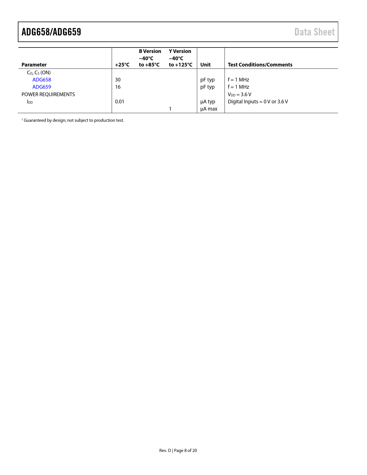 ADG658/ADG659. Data Sheet. B Version. Y Version. −40°C. Parameter. +25°C. to +85°C. to +125°C. Unit. Test Conditions/Comments