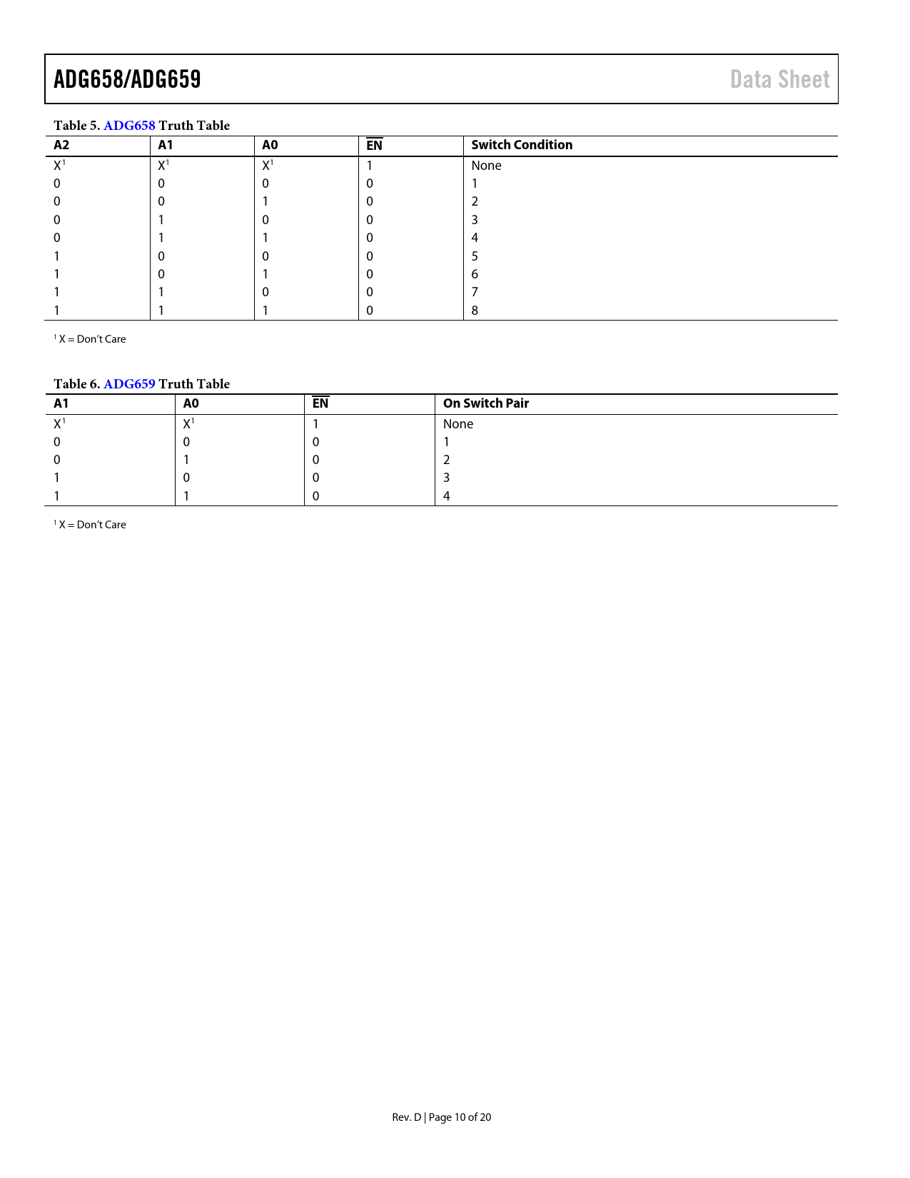 | Páginas / Página | 20 / 10 — ADG658/ADG659. Data Sheet. Table 5. ADG658 T. ruth Table A2. Switch … |