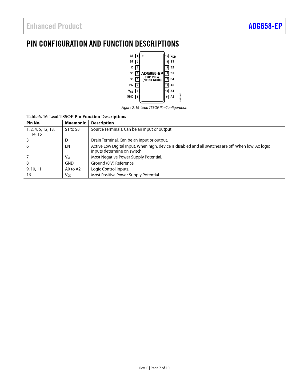 Enhanced ProductADG658-EPPIN CONFIGURATION AND FUNCTION DESCRIPTIONSS5116VDDS7215S3D314S2S8413ADG658-EPS1TOP VIEWS6512S4(Not to Scale)EN611A0V710A1SSGND89A2 002 15981- Figure 2. 16-Lead TSSOP Pin Configuration Table 6. 16-Lead TSSOP Pin Function Descriptions Pin No.Mnemonic Description 1, 2, 4, 5, 12, 13, S1 to S8 Source Terminals. Can be an input or output. 14, 15 3 D Drain Terminal. Can be an input or output. 6 EN Active Low Digital Input. When high, device is disabled and all switches are off. When low, Ax logic inputs determine on switch. 7 VSS Most Negative Power Supply Potential. 8 GND Ground (0 V) Reference. 9, 10, 11 A0 to A2 Logic Control Inputs. 16 VDD Most Positive Power Supply Potential. Rev. 0 | Page 7 of 10 Document Outline FEATURES ENHANCED PRODUCT FEATURES APPLICATIONS FUNCTIONAL BLOCK DIAGRAM GENERAL DESCRIPTION PRODUCT HIGHLIGHTS TABLE OF CONTENTS REVISION HISTORY SPECIFICATIONS DUAL SUPPLY 5 V SINGLE SUPPLY 2.7 V TO 3.6 V SINGLE SUPPLY ABSOLUTE MAXIMUM RATINGS ESD CAUTION PIN CONFIGURATION AND FUNCTION DESCRIPTIONS TYPICAL PERFORMANCE CHARACTERISTICS OUTLINE DIMENSIONS ORDERING GUIDE